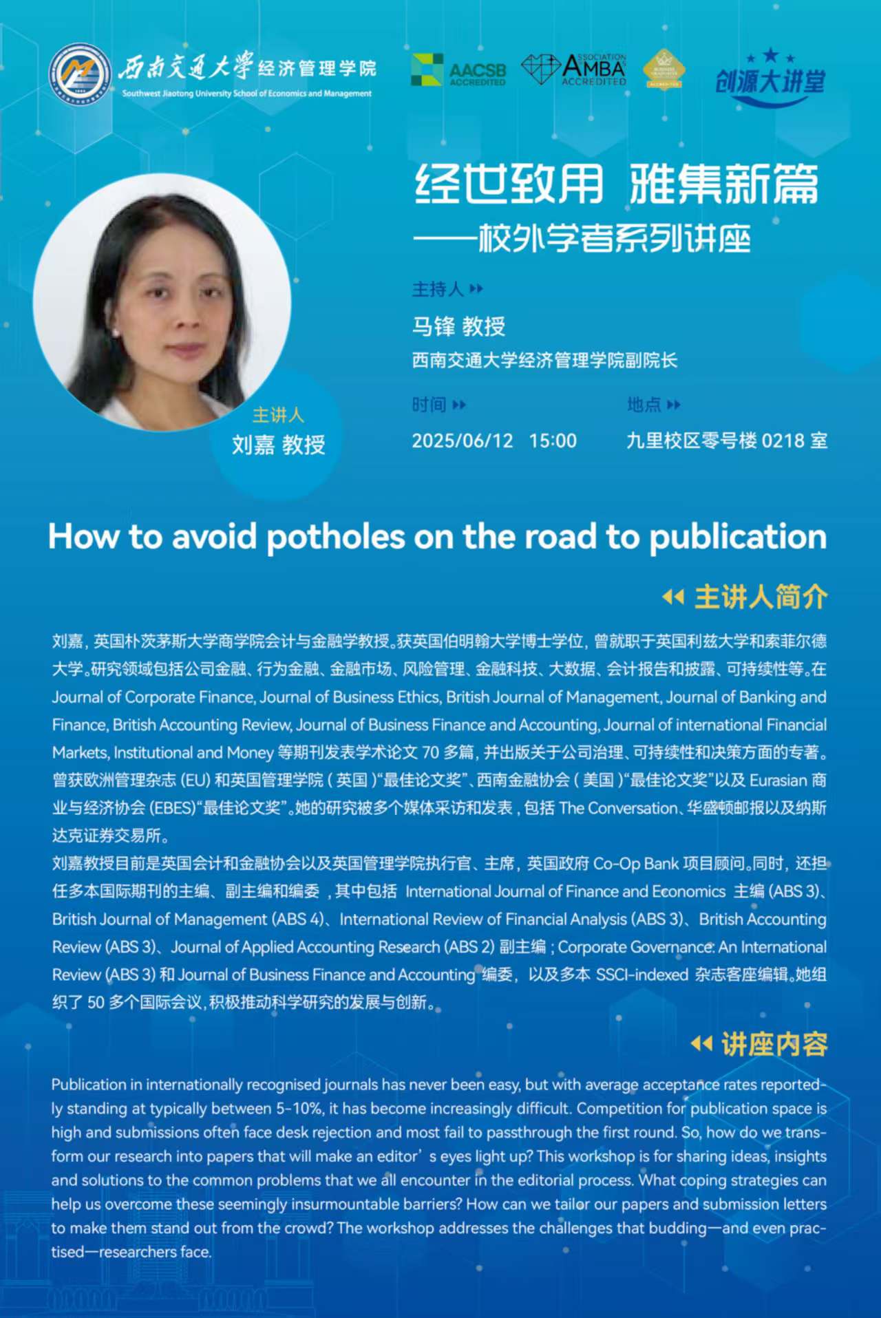英国朴茨茅斯大学商学院刘嘉教授学术讲座