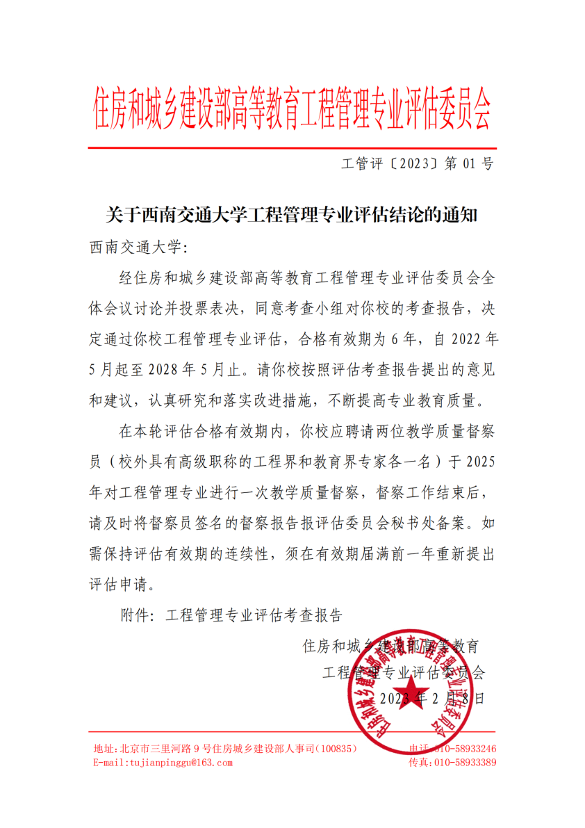 Recently, the Higher Education Engineering Management Professional Assessment Committee of the Ministry of Housing and Urban-Rural Development (MOHURD) issued a notification (Engineering Management Evaluation [2023] No.01) on the evaluation conclusion of the Engineering Management program at Southwest Jiaotong University (SWJTU). The program passed the evaluation certification smoothly, and its qualified period is 6 years, from May 2022 to May 2028.