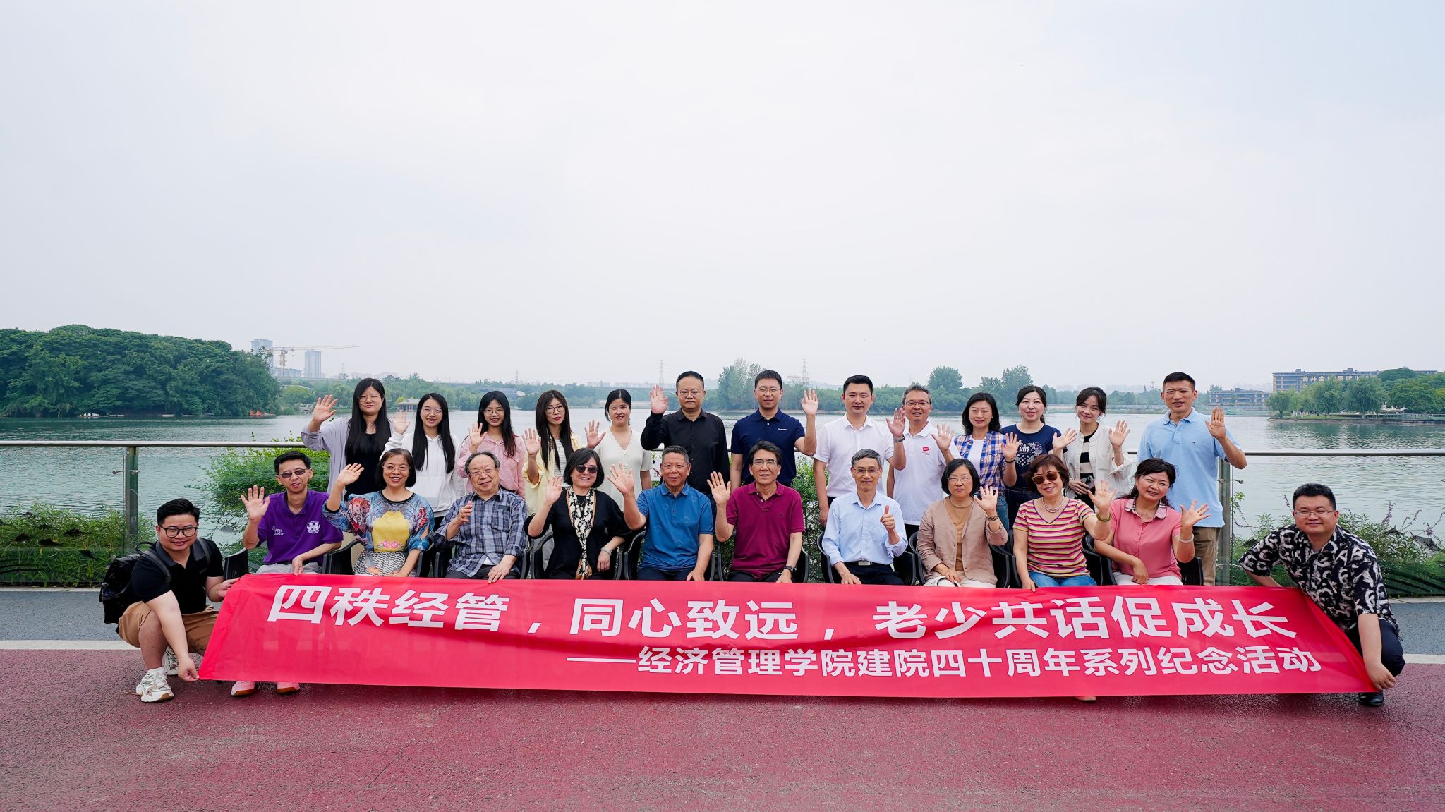 建院四十周年,6月5日学院组织离退休教师在成都市北湖公园生态绿道开展以“同心致远,老少共话促成长”为主题的徒步活动。学院党委书记郭强,院长韩科,党委副书记余小英、晏理斌,青年教师代表以及离退休教师共30余人参加了此次活动。