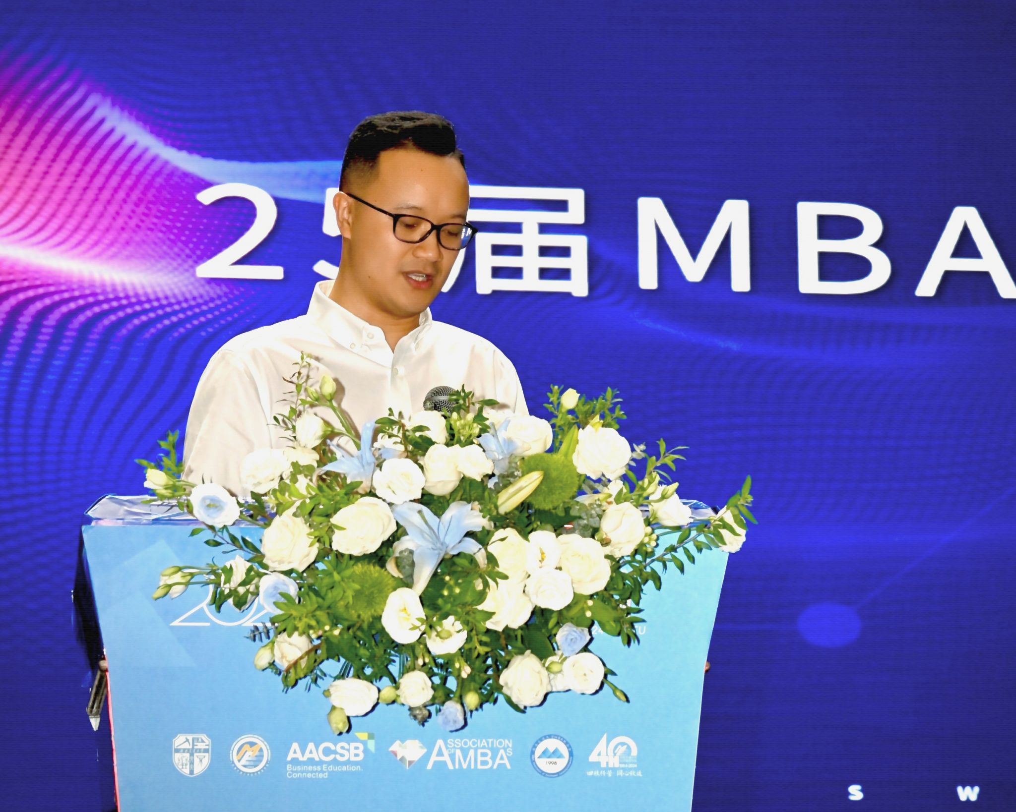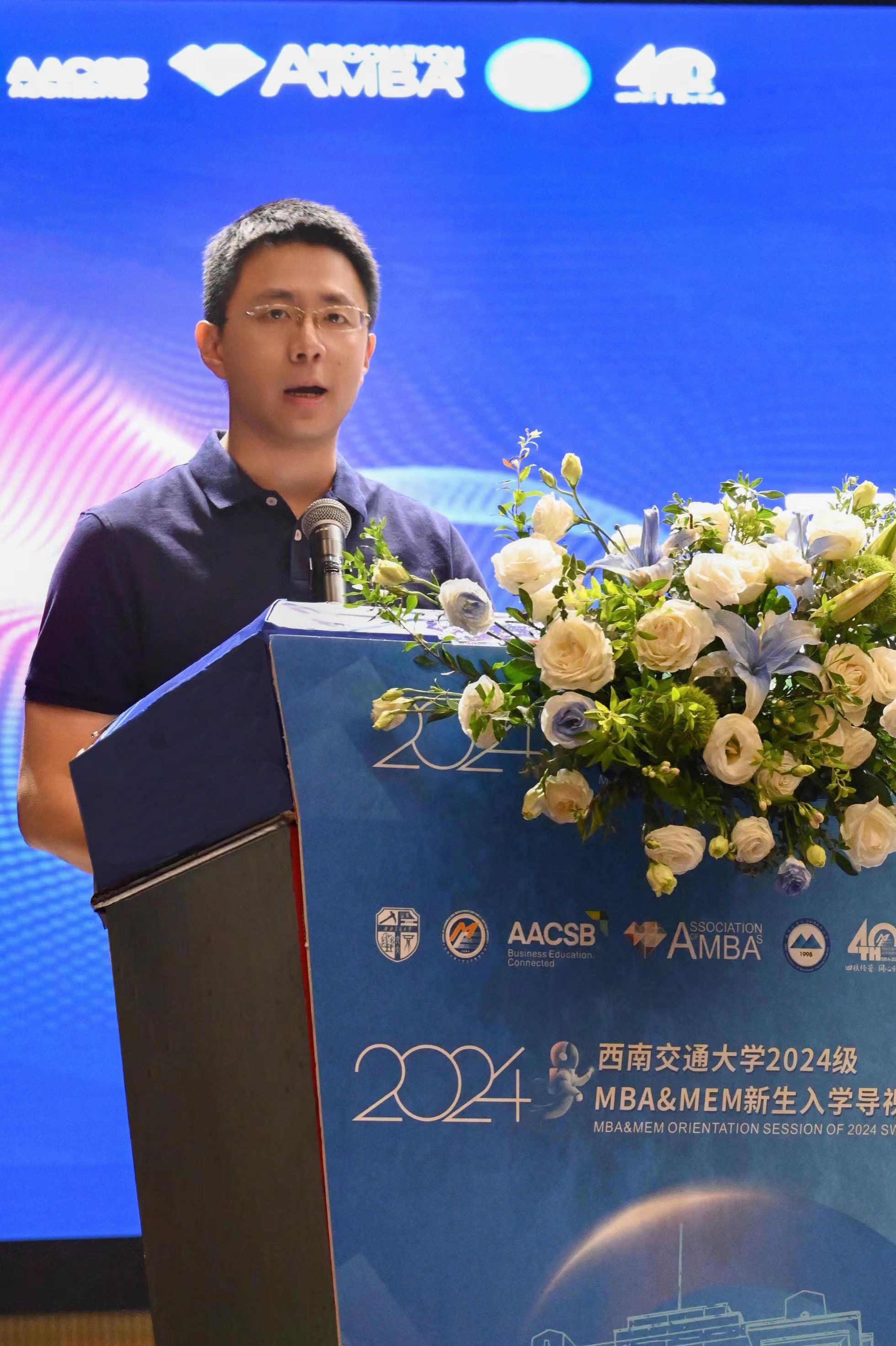 院长韩科致欢迎辞,韩科代表学院全体师生对2024级MBA&MEM新生表示热烈的欢迎。希望同学们在学院的学习生活中,能够充分将个人发展与国家战略、时代需求紧密结合,通过跨学科的学习与研究,深入洞察行业需求,将管理智慧与现代信息技术深度融合,以实际行动助力新质生产力的发展。鼓励大家勇于探索,敢于创新,以扎实的专业知识、卓越的实践能力和世界情怀开阔眼界、扩展思路,主动对接共建“一带一路”,实现高等教育与新质生产力发展双向奔赴。
