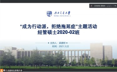 2021322,西南交通大学经济管理学院硕士20202班举办“成为行动派,拒绝拖延症”的主题班级活动,全班同学积极参加本次活动本次班级活动分为视频学习以及拖延症测试两项