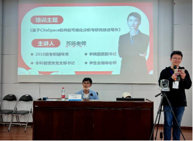 于J0215演讲厅开展“星火经英”计划第九期第四次团干部培训。本次培训由学院团委副书记、2019级辅导员苏扬主讲,主题为“基于CiteSpace软件的可视化分析与研究综述写作”。本次讲座旨在帮助大二大三的同学们学会如何查找文献,充分利用学术资源,进行学术研究。