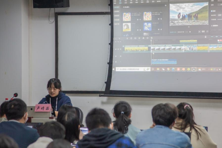卢婧茹从开头、主题和片尾三个部分展开视频讲解。在开头部分,卢婧茹分享了如何选择合适的背景音乐,达到更好的效果;在主体部分,卢婧茹以视频为例,示范了卡点、转场、画中画等技术的基本操作;在片尾部分,卢婧茹向团干部们介绍了播放演职人员滚动字幕的技巧,并强调要多使用活泼有趣的素材提升视频质量,吸引观众。