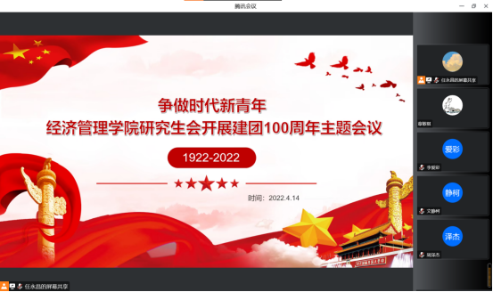 研究生会于2022年4月14日在线上开展“建团100周年”主题会议,大家共同学团史、知团情,一起回顾中国共青团百年光辉岁月,探讨学习重要精神。