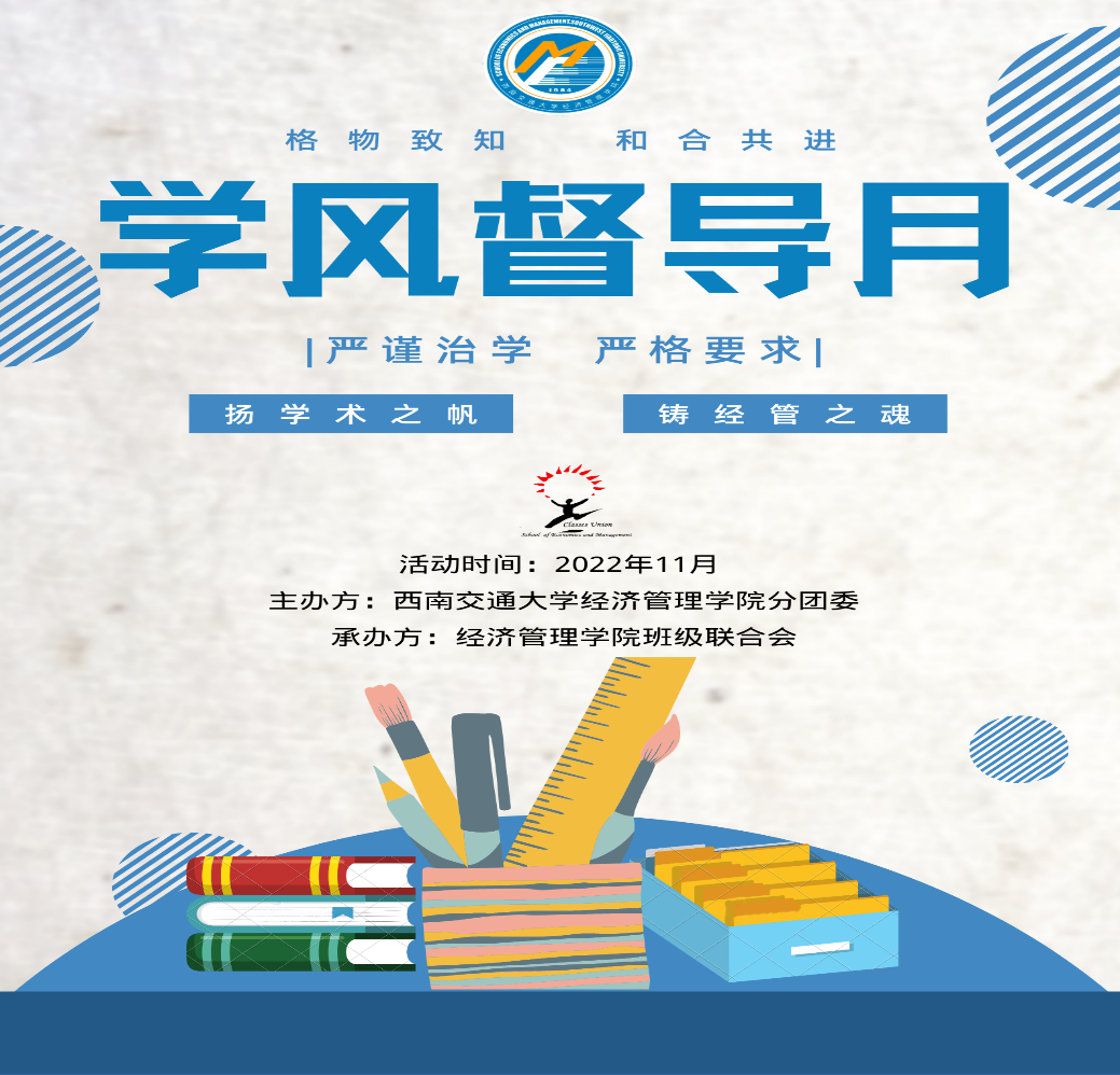 “扬学术之帆 铸经管之魂”学风督导月活动就此圆满结束。本次活动坚持学风建设与班风建设相结合,发扬我校“严谨治学、严格要求”的“双严”传统,践行“格物致知,和合共进”的学院精神,营造浓郁学习氛围、创造优良学风,促进学风建设的深入开展,形成学风建设长效机制。