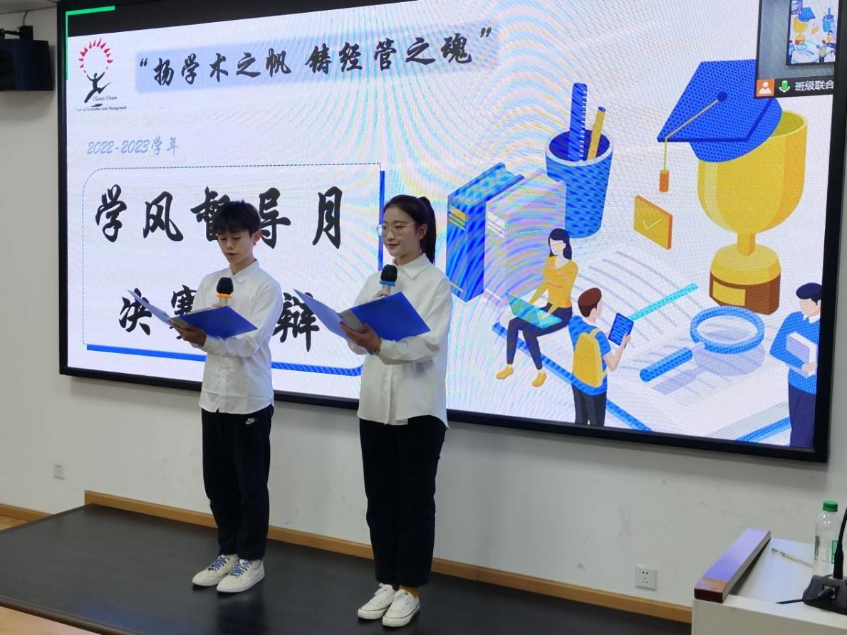 2022年11月26日19:30,“扬学术之帆 铸经管之魂”学风督导月学风建设沙龙活动在九里校区零号教学楼0318教室顺利举办,本次活动采取线上线下相结合的方式举行。第四届感恩中国近现代科学家奖学金获得者、现已保研至复旦大学的黄纪凯作为主讲嘉宾出席本次活动。黄纪凯结合自身经历,分别从保研、就业两个方面为本科2021、2022级学生分享了相关的经验与方法,帮助本科2021、2022级学生点明学习生活的重要节点、指明学习方向、拓宽视野、扫除盲区,从而更好地进行大学生涯规划。
