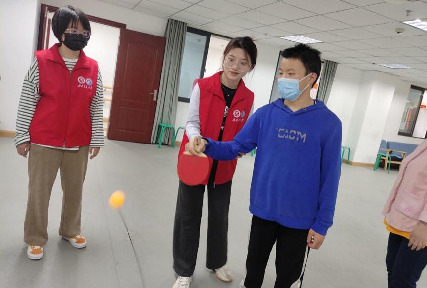 运动兴趣班的大朋友们身体素质较好,在志愿者的带领下积极而有序地完成了热身运动,分组进行紧张有趣的乒乓球和篮球比赛。在确保安全地前提下,大朋友们的身体机能得到了很好的锻炼。