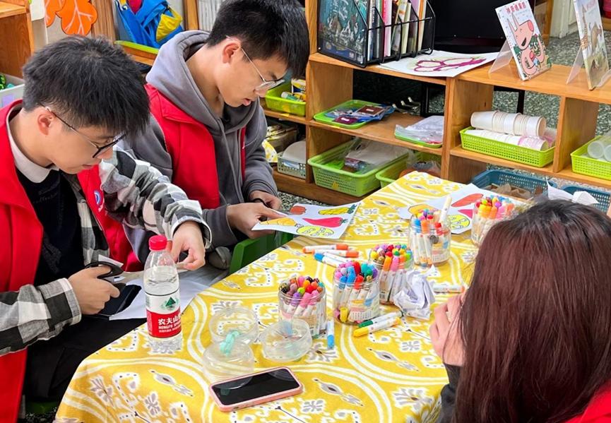 在手工班的志愿者们与大朋友一起画画,画出春天里的生机勃勃,画出自然万物的和谐共生。除画画以外,几位大朋友还展示了精湛的折纸技巧,并将纸船、纸蝴蝶作为心意送给了志愿者。