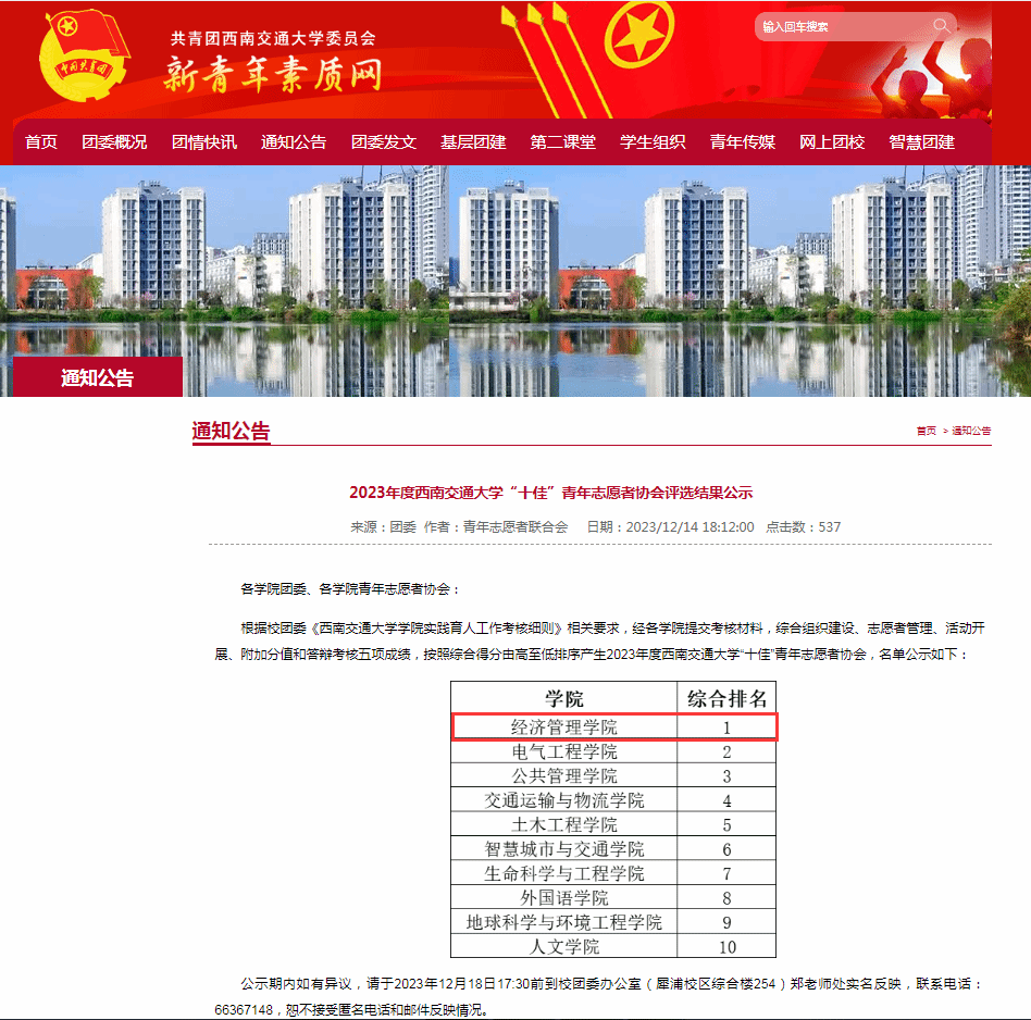 青年志愿者协会综合考评第一,获得“十佳青协”荣誉,取得了优异的成绩。