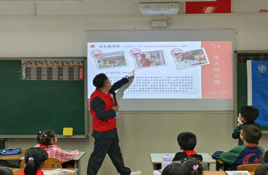 来到益州小学二年级十三班的课堂,陈建奇首先向小朋友们介绍了团队的成员以及经管青协的组织架构和概况,其中涵盖了各个部门的具体介绍及其职责,还包括阳光家园、敬老院、善工家园、交大幼儿园等志愿服务基地,以及爱心雨伞、旧衣回收、阳光义卖等青协品牌活动。随后,陈建奇对青鸽志愿服务队进行了介绍:“青鸽志愿服务队是包子漫画