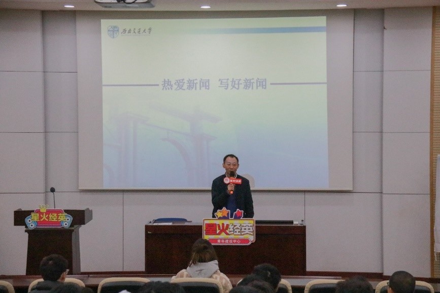 他首先强调了新闻对人们认识政治经济发展状况、理解社会现象、掌握最新资讯的重要性,抛出“为什么要学习写新闻?”这一问题,与同学们亲切交流,现场气氛热烈。接着,阮琦总结初学新闻写作者常见问题,提出从入门到写手转变“三步走”:一是熟悉名词,掌握格式,边学边练;二是注重积累,模仿对比,总结提高;三是注重突出特色,提炼亮点,抓人眼球,善于聚焦。此外,阮琦在培训中将理论与实例相结合,讲解新闻稿件与文件、信息稿件的区别与联系,详细介绍了新闻导语的写作技巧,为初学新闻写作的同学们答疑解惑、扫除常见障碍。
