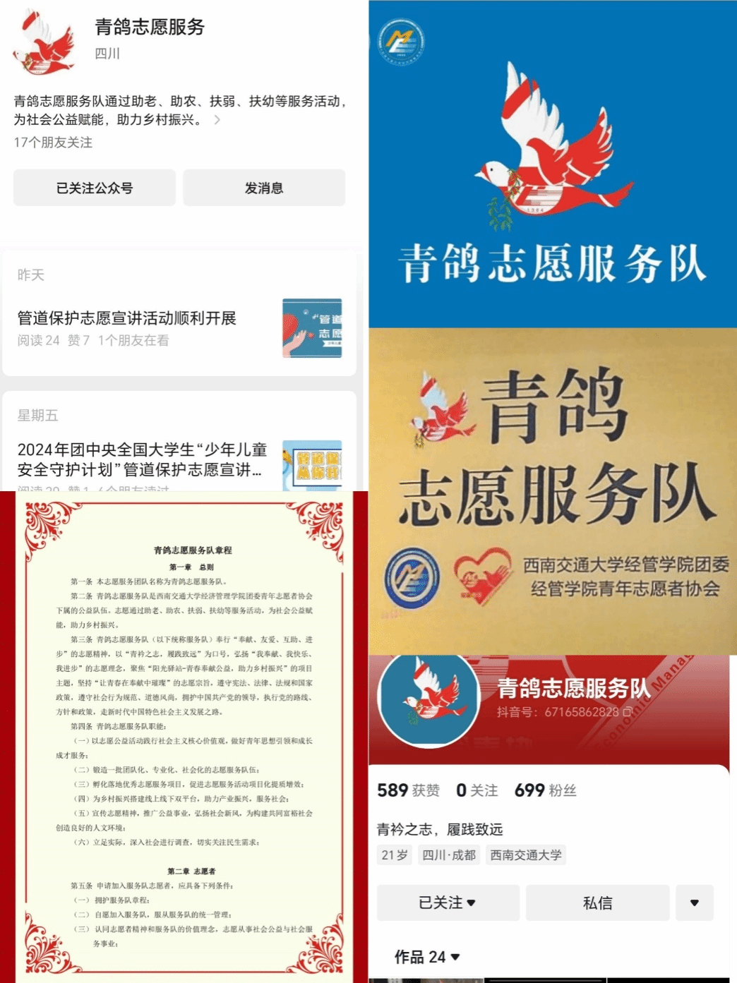 青年志愿者的综合能力。2023年协会成立了“青鸽志愿服务队”,以“青鸽”为依托,锻造一批团队化、专业化、社会化的志愿服务队伍,不断总结凝练,深挖实践活动价值,孵化落地优秀社会实践项目,提高学院广大青年参与社会实践的热情与活力。