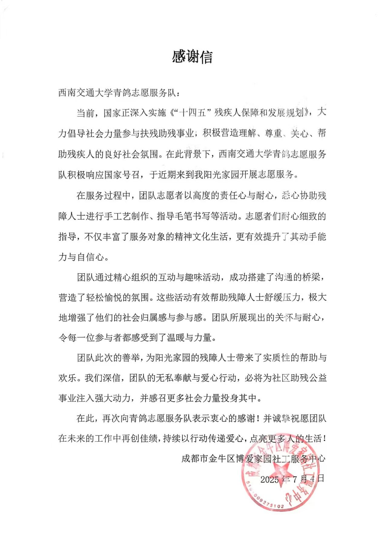 青鸽志愿服务队积极响应号召,于近日在成都市金牛区阳光家园开展了以“众爱助残碍,群善汇福珊”为主题的专项志愿活动。此次活动专为智力障碍的“大孩子们”量身打造,通过一系列丰富多彩的内容,为他们送去关爱与温暖,助力其健康成长。