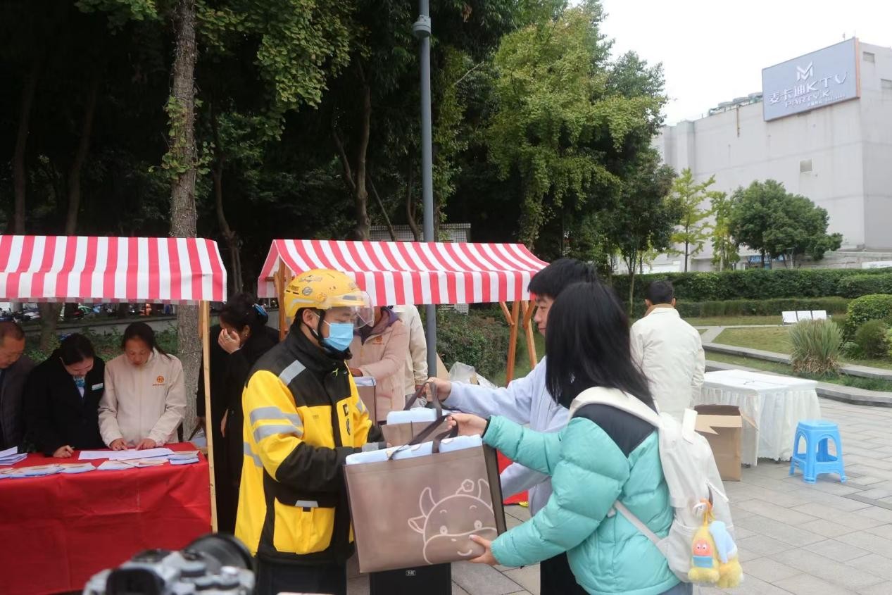 最后,现场工作人员和2025级工商管理类8班团支部的青年志愿者们一同为每位参与活动的骑手送上冬日暖心礼包。