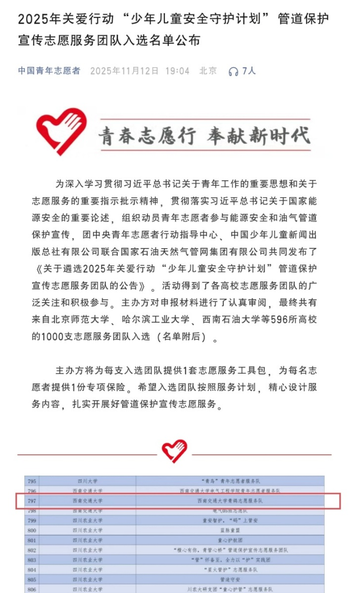 “青鸽志愿服务队”从全国千余所高校的数千支队伍中脱颖而出,成功入选2025年关爱行动“少年儿童安全守护计划”管道保护宣讲志愿服务团。
