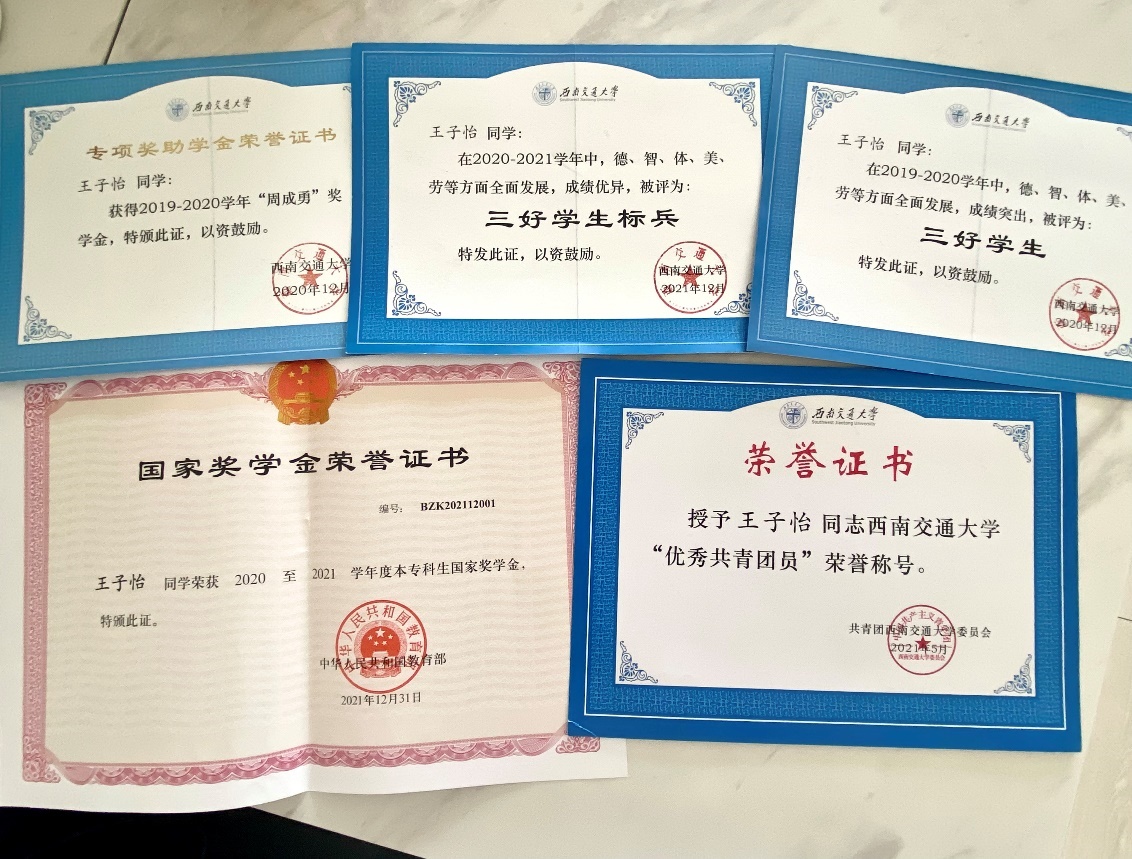 作为一名学生,王子怡明白自己的首要任务仍然是学习。因此,在学习上,王子怡从不打马虎眼。“严以律己,宽以待人”,是王子怡的人生准则,在学习上也同样如此。她不浪费学习时间,不做重复工作,高效完成学习任务。很多同学抱怨学习任务多,学习时间紧,而王子怡却能在学习任务繁多的情况下,同时也能做好团支书的工作。这与她科学有效的学习方法密不可分:在课堂前,她会提前将下节课的课件打印下来以备在课堂上记录笔记;在课堂上,她积极主动地与老师进行互动;在课堂后,她及时温习所学知识,认真完成老师布置的作业。因此在大二、大三学年,王子怡的综合成绩均位列金融专业第一,获得了国家奖学金、“周成勇”奖学金,以及校“三好学生”、校“三好学生标兵”的荣誉称号。
