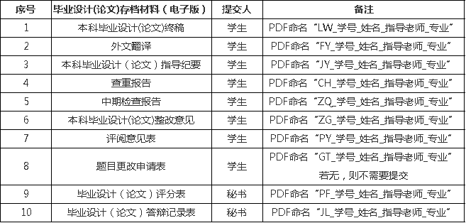 电子版按表2整理后发送至邮箱[email protected],发送同时务必抄送指导老师审核。邮件主题“存档_学号_姓名_指导老师_专业”,附件按表2备注中命名。电子版材料将用于后期毕业设计(论文)抽检工作,请老师同学们高度重视。