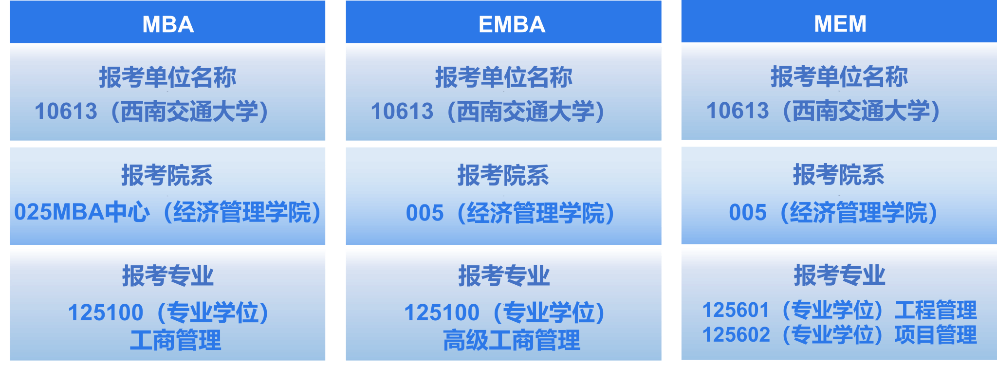 培养目标:始终秉承学校“交通天下”的办学使命,依托学校强大的工科背景和鲜明的交通运输行业资源优势,围绕国家“一带一路”和成渝地区双城经济圈建设的重大战略需求,致力于培养胸怀家国情怀、具备全球视野和卓越领导力的新时代商业领袖。