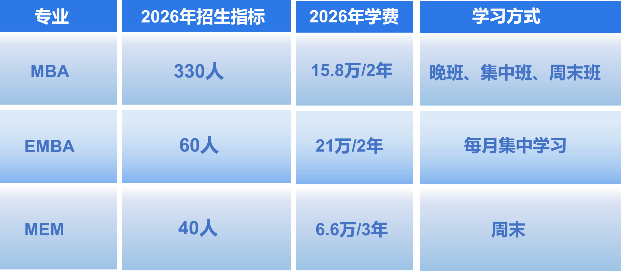 专业硕士项目(MBA、EMBA、MEM)课程体系紧贴国家发展战略与行业前沿,聚焦管理理论与实践融合,分层次、模块化打造高水平人才培养体系。