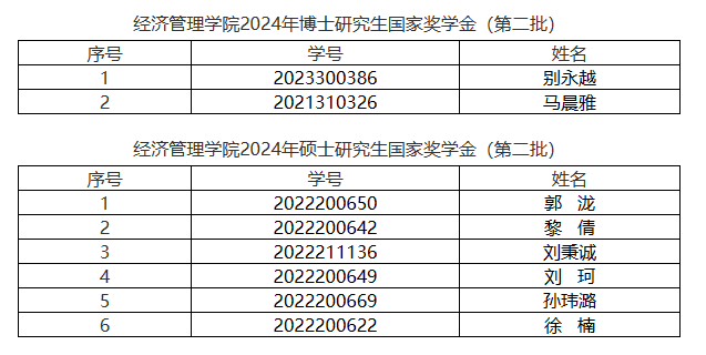 2024年研究生国家奖学金(第二批)获奖名单。现公示如下: