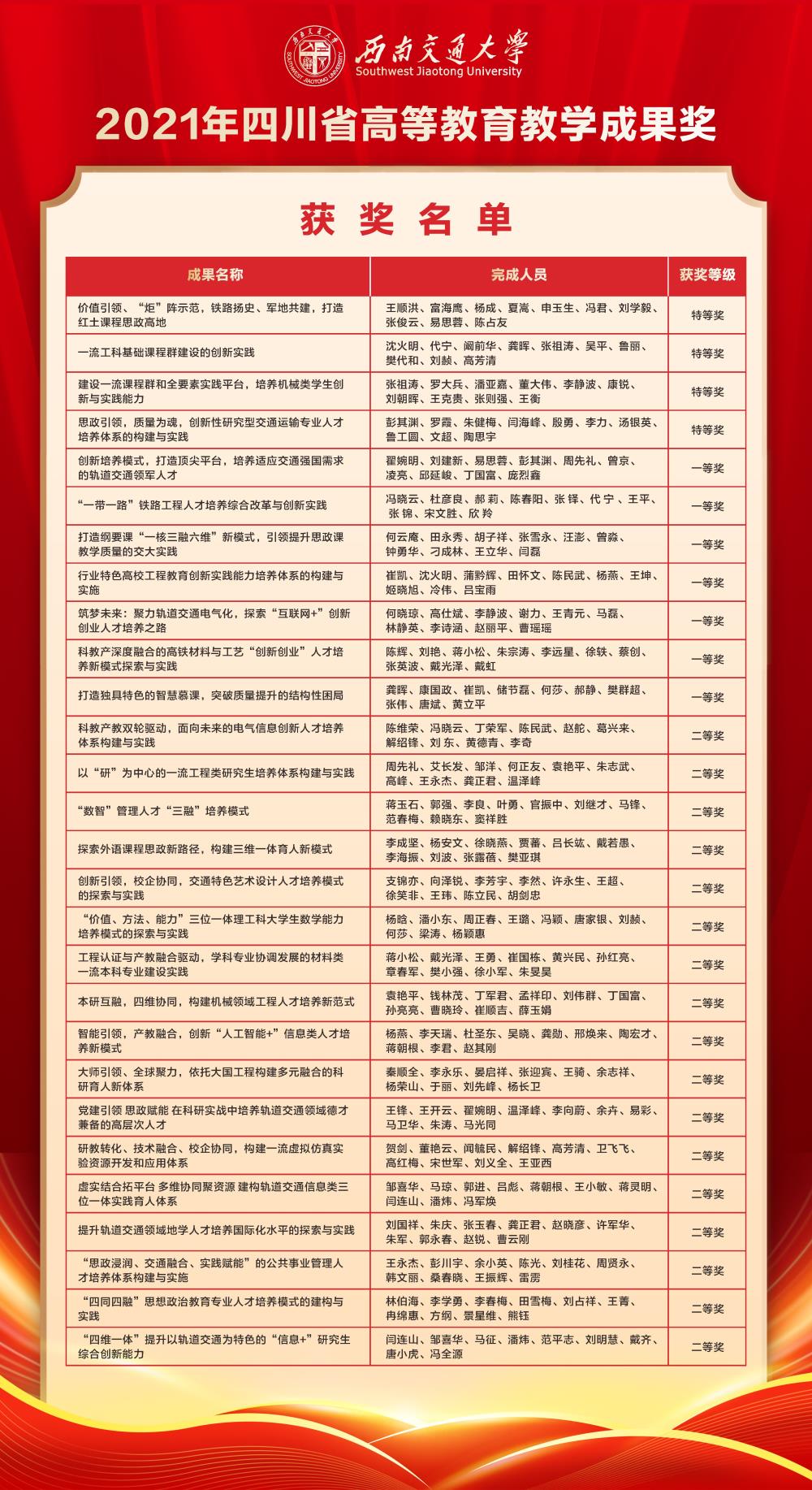 主持获批四川省高等教育教学成果奖特等奖4项、一等奖7项、二等奖17项,获特等奖数量全省第二。另外参与获批特等奖1项、二等奖3项。在本届四川省高等教育教学成果奖获奖率减少30%的前提下,学校主持获奖总数较上届增加2项,获奖数量占全省比例提高17%。