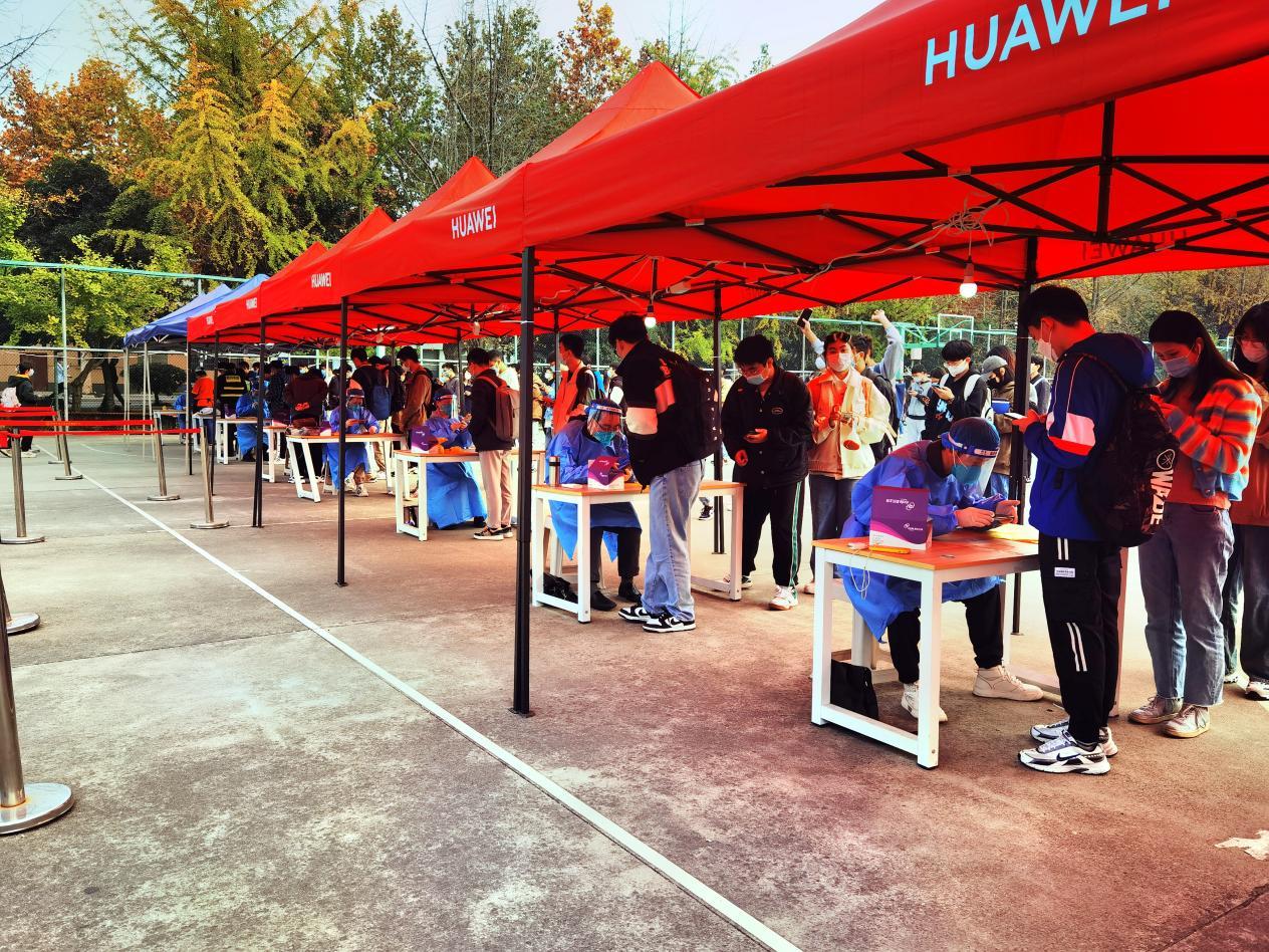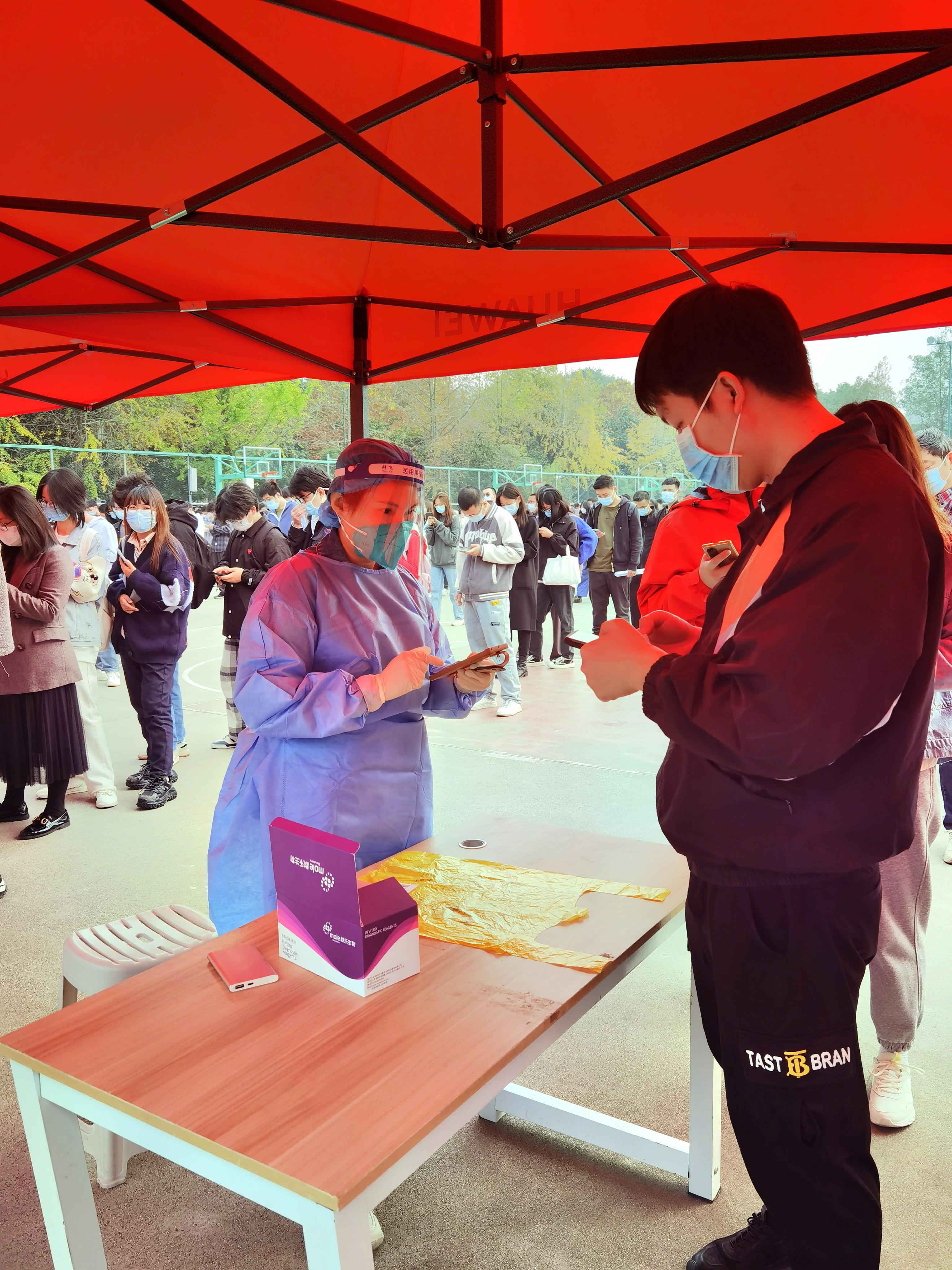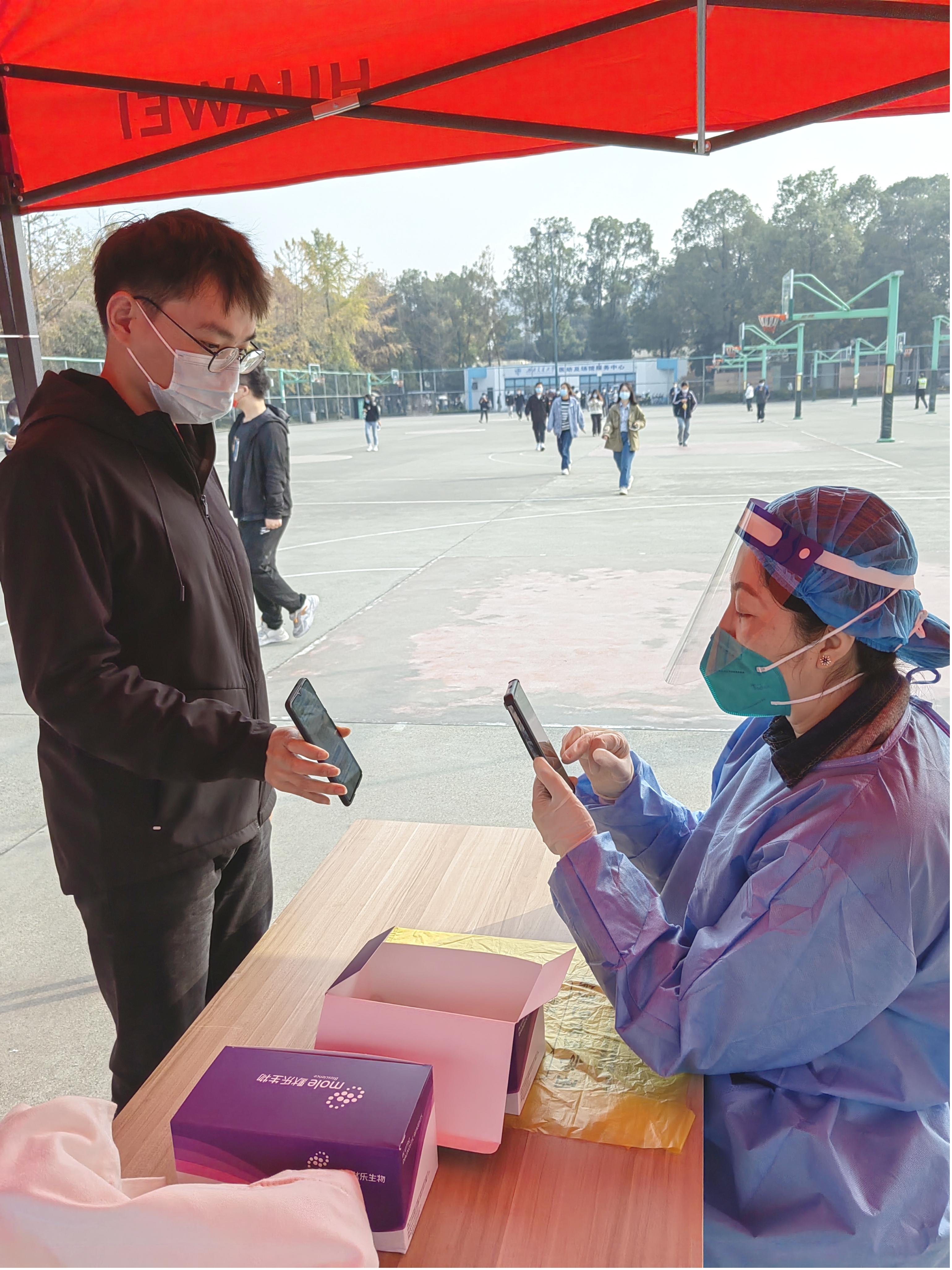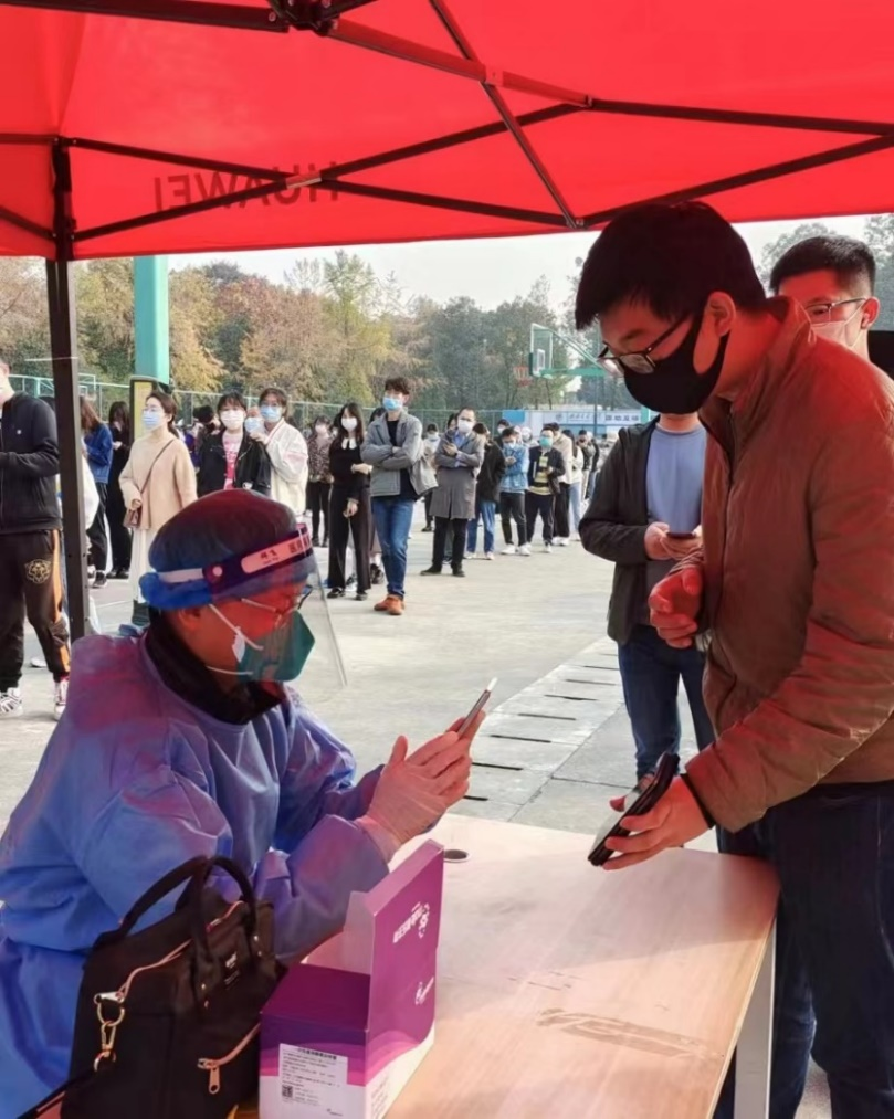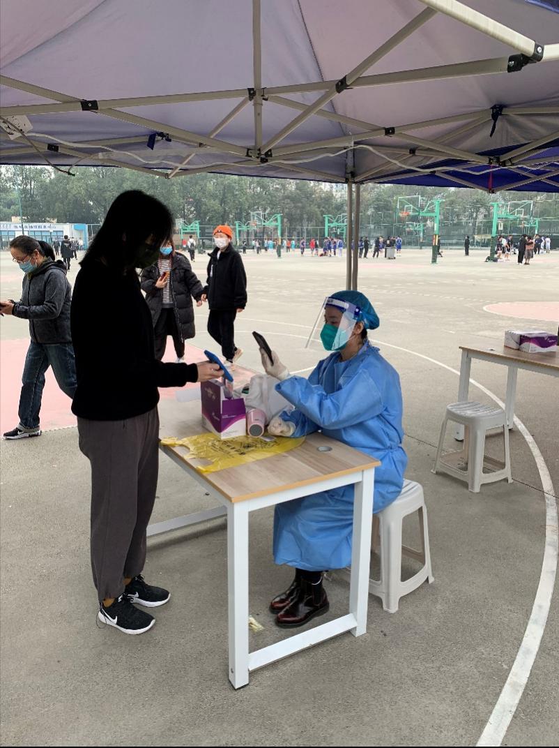 早上8点,九里校区核酸检测工作准时开始。学院13位志愿者老师们严格按照防疫要求,尽职、细致地为参与核酸检测的师生进行信息扫码录入工作。现场不一会儿就排队如长龙,面对许多参检者天府健康通打不开、健康码无法显示的突发异常情况,学院志愿者老师们耐心指导大家出示个人身份证,或对没有带身份证的人员现场一对一单独录入数据参加核酸检测。在志愿者、医务人员和广大师生的共同努力下,全员奋战5个小时,圆满完成了11月24日九里校区逾万人的核酸检测工作。