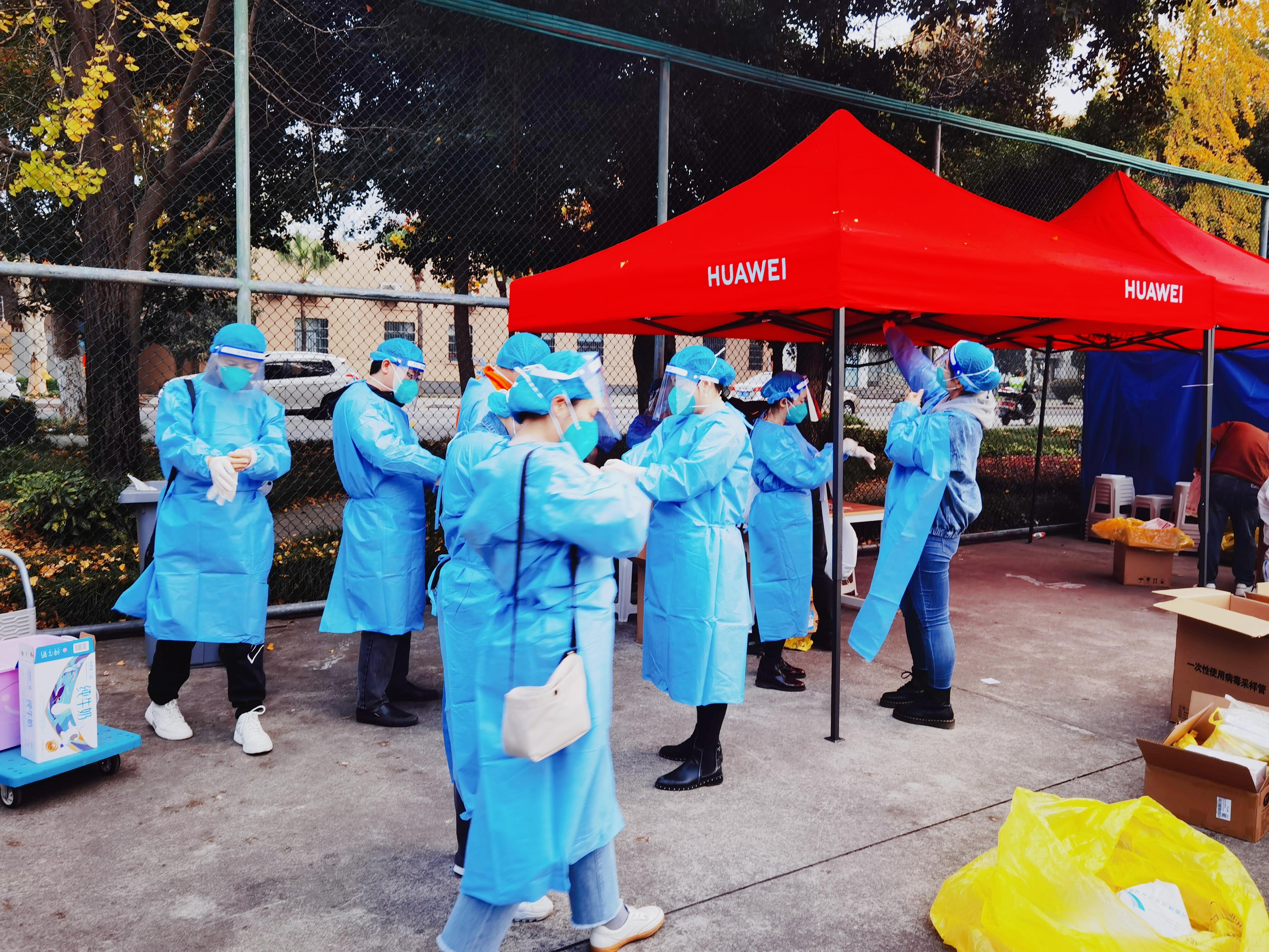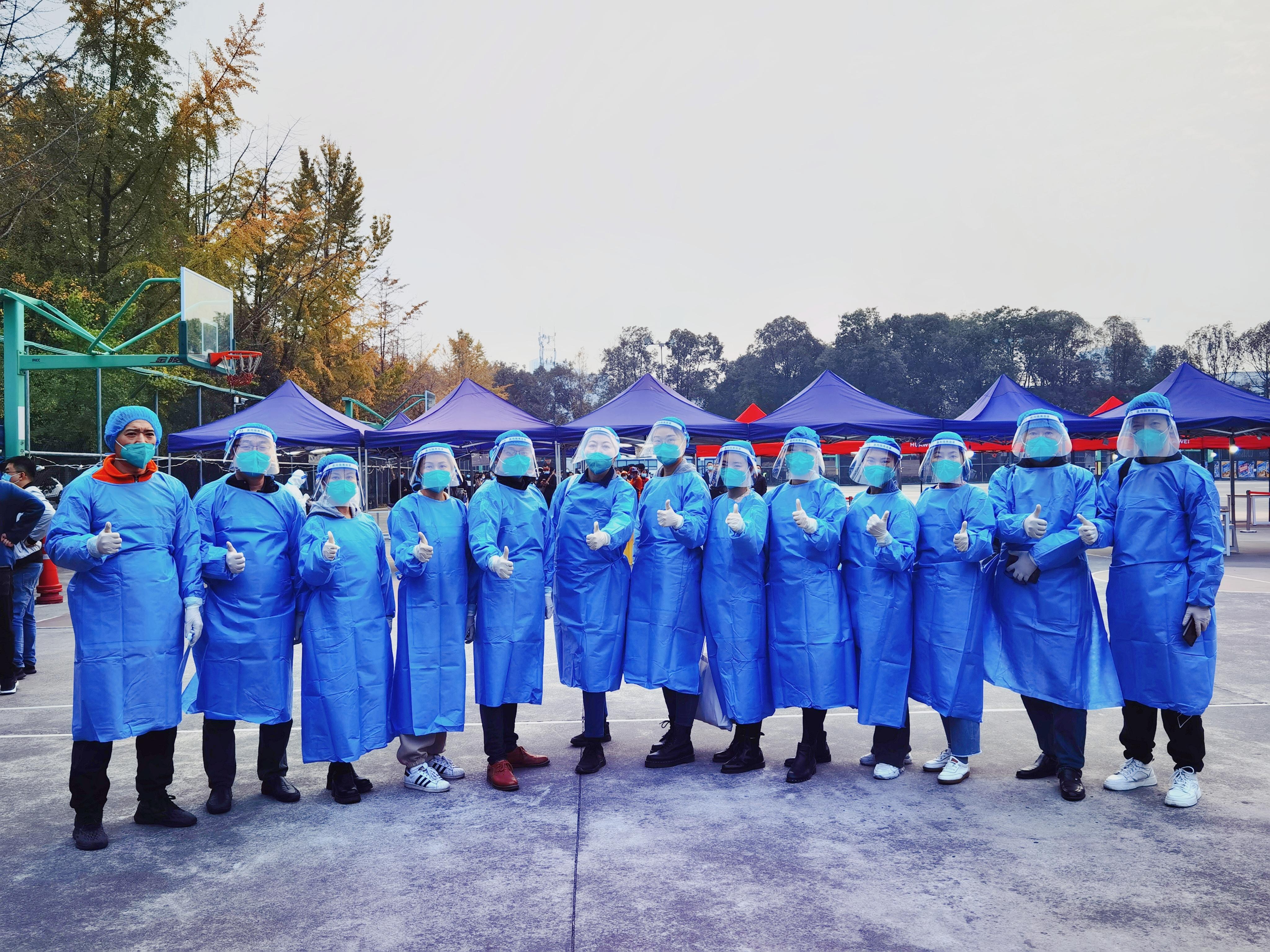 通过教职工个人报名、学院党委推荐,组织了13名教职工再次担任11月24日九里校区校内核酸检测工作志愿者,协助核酸采样工作。到场参与核酸检测志愿服务工作的老师有:何鹏、罗伟民、崔长江、何建晖、尹一、漆敏、练婧曦、姚霁芸、张媛媛、王熙、向洪信、滕倩、宋洁。24日清晨7点30分,天刚蒙蒙亮,志愿者们准时到达九里校区篮球场核酸检测点,有序地领取防护物资,互相帮助完成防护服的穿戴,认真听工作人员讲解,统一学习操作流程,做好各项准备工作。