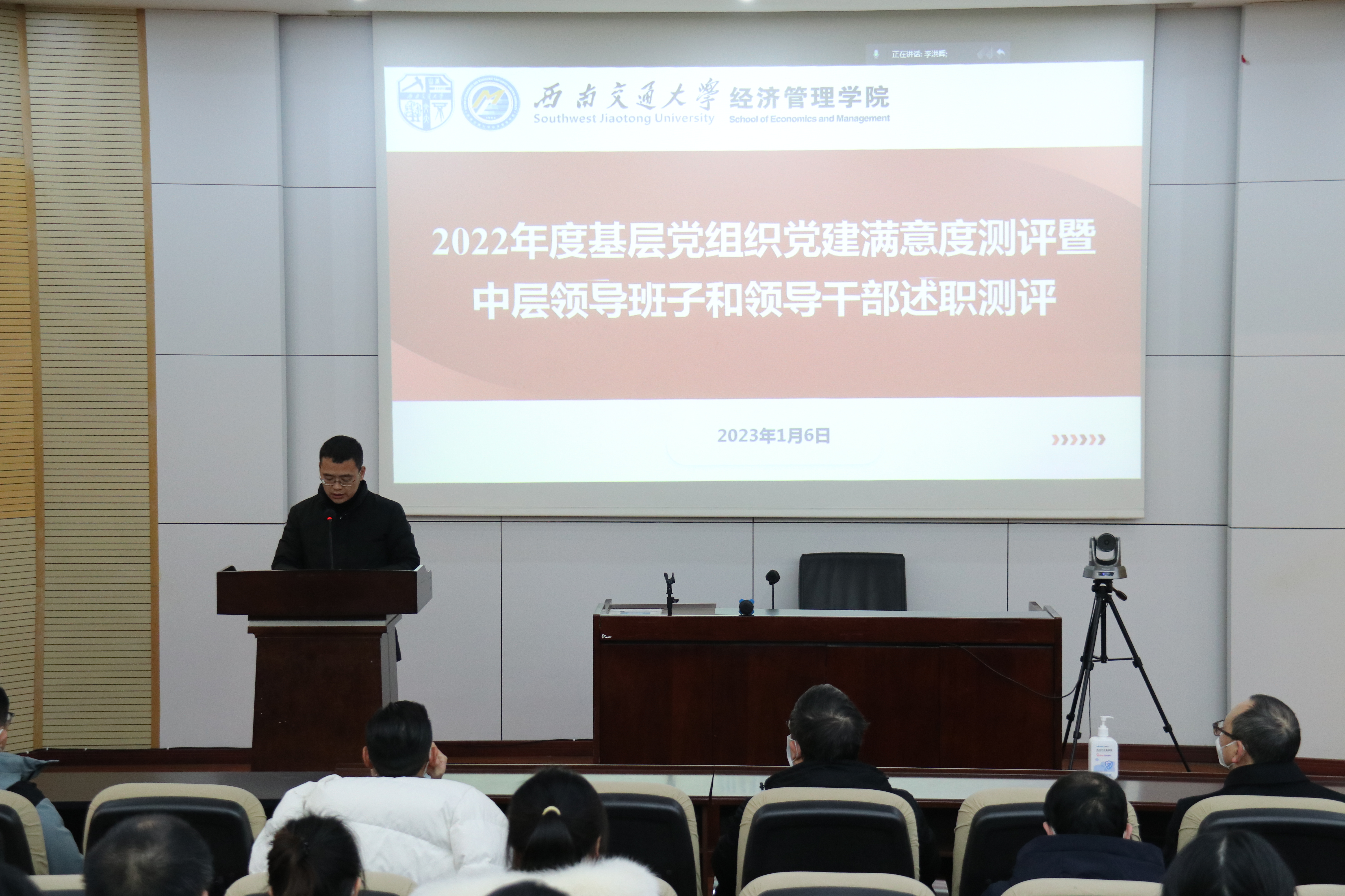 在党建满意度测评环节,王斌代表学院党委进行了述职。他从持续推进机制制度建设,着力推进“规范引领”工程;强化师生思想政治教育,着力推进“思政铸魂”工程;不断增强组织建设与保障,着力推进“活力建设”工程;坚持树典型作表率,着力推进“榜样示范”工程;强化教育制度监督,着力推进“从严治党”工程等五个方面,对学院2022年度的党建工作进行了汇报,并谈到学院党委在思想武装、领导班子建设、党建工作创新、党建与中心工作融合度这四个方面存在的问题及其原因,在此基础上提出了下一步的工作打算:一是狠抓师生的思想政治教育和理论武装;二是狠抓领导班子和干部队伍建设;三是狠抓基层党组织建设和党员的教育管理;四是狠抓党建工作与中心工作的深度融合;五是狠抓全面从严治党。