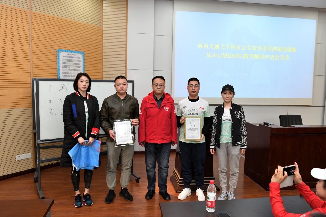 随后,举行了2022级EMBA菁英跑团授旗仪式。郭强院长授旗,并代表校友会戈友会俱乐部向2022级EMBA新生龚荣、王英博颁发了第十八届戈壁挑战赛领队聘书。