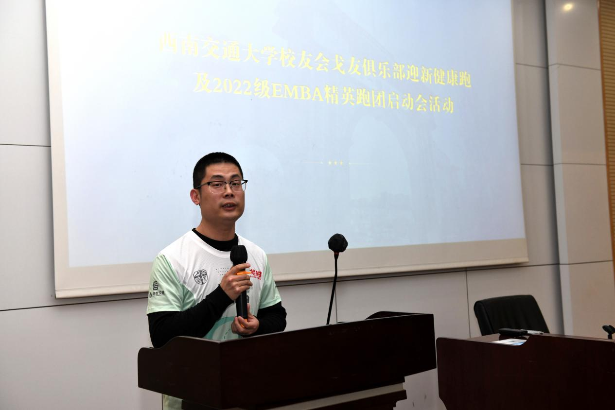 2022级EMBA代表王英博发言,他表示要以2022级EMBA菁英跑团的成立为新契机,接好戈赛的“接力棒”,在以后的活动中不断充实菁英跑团的新力量,带动同学们参与到戈赛中。