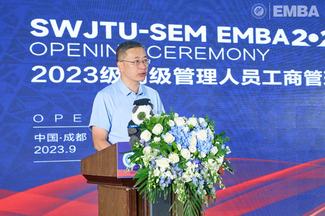 的历史沿革、办学特色和发展成就,强调了EMBA教育在学校发展战略中的重要地位和作用。刘长军副校长告诫大家要有创新思维,要有长远的眼光,培养交通天下的广阔胸襟,解决时代带来的挑战。他希望新生依托学院的人才培养体系,成为跨领域、跨行业的精英,扬帆起航!
