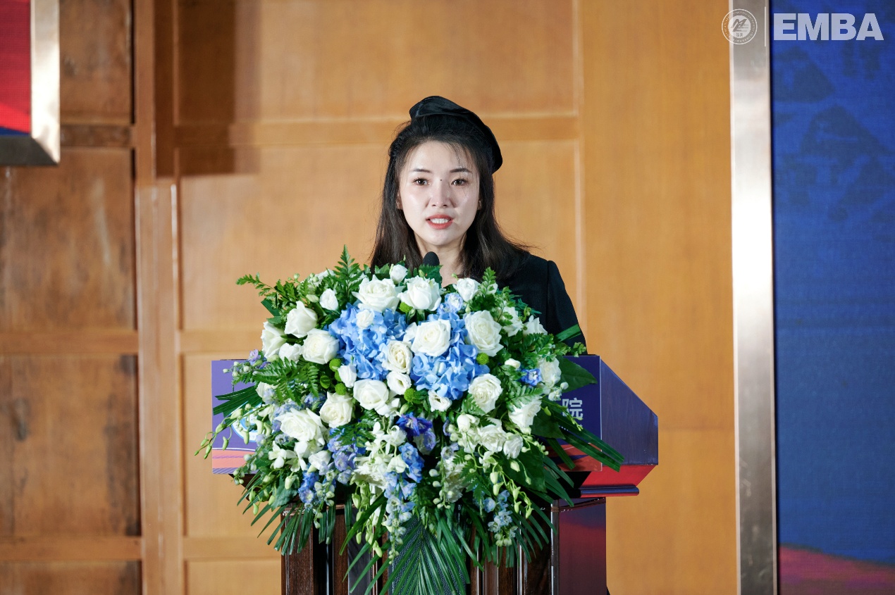 随后,曾楠女士作为EMBA新生代表发言,她代表全体新生向学校和老师表示感谢和敬意,向校友和同学表示祝福和期待。她表示,选择交大EMBA是一种荣幸和责任,是一次学习和成长的机会和挑战。她希望自己和同学们能够坚持梦想、勇于创新、互相支持、共同进步,为交大EMBA增光添彩。