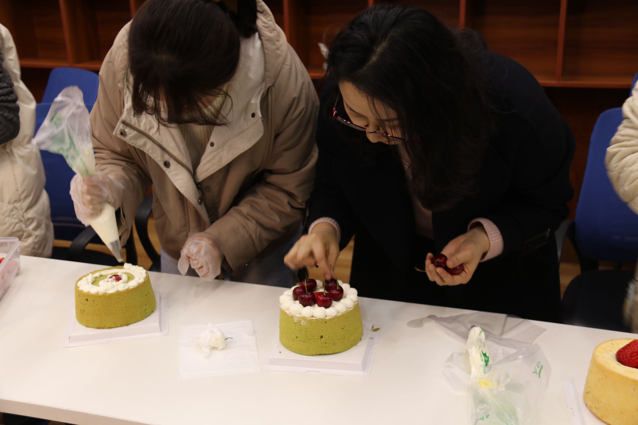 在烘焙师的指导下,老师们学习认识每一种烘焙原料,了解制作步骤,掌控好原料比例与烤箱温度,亲手制作精美糕点。一枚枚“柿柿如意”曲奇、一份份精致的水果蛋糕,一杯杯沁人心脾的茶饮,让在场的每一位教职工都感受到了满满的幸福感。随着香味飘散弥漫,活动现场充满了欢声笑语,留下了珍贵、美好的回忆。