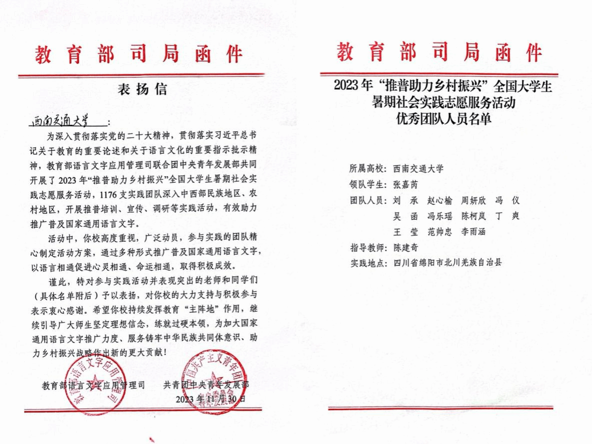 近年来,青鸽志愿服务队队员们在学院老师的悉心指导下,进社区、下农村、访群众,脚踏实地,深入基层开展异彩纷呈的实践活动,活动涉及新农村建设、文化传承、志愿服务等各个方面,实践队员边实践边学习边探索,在实践中历练了本领,淬炼了心灵,在全国各地发挥着自己的光和热。实践活动得到了当地政府、群众和社会各界的一致好评,取得了不错的成绩。2022年青鸽志愿服务队入选中国青年报评选的“全国大学生暑期百强实践团队”;2023年青鸽志愿服务队成功入选了由共青团中央青年发展部、中国青年报、中国青年网共同举办全国大中专学生志愿者暑期文化科技卫生“三下乡”社会实践“镜头中的三下乡”活动“优秀图片团队”和“优秀视频团队”,同时团队还收到了来自教育部的表扬信!