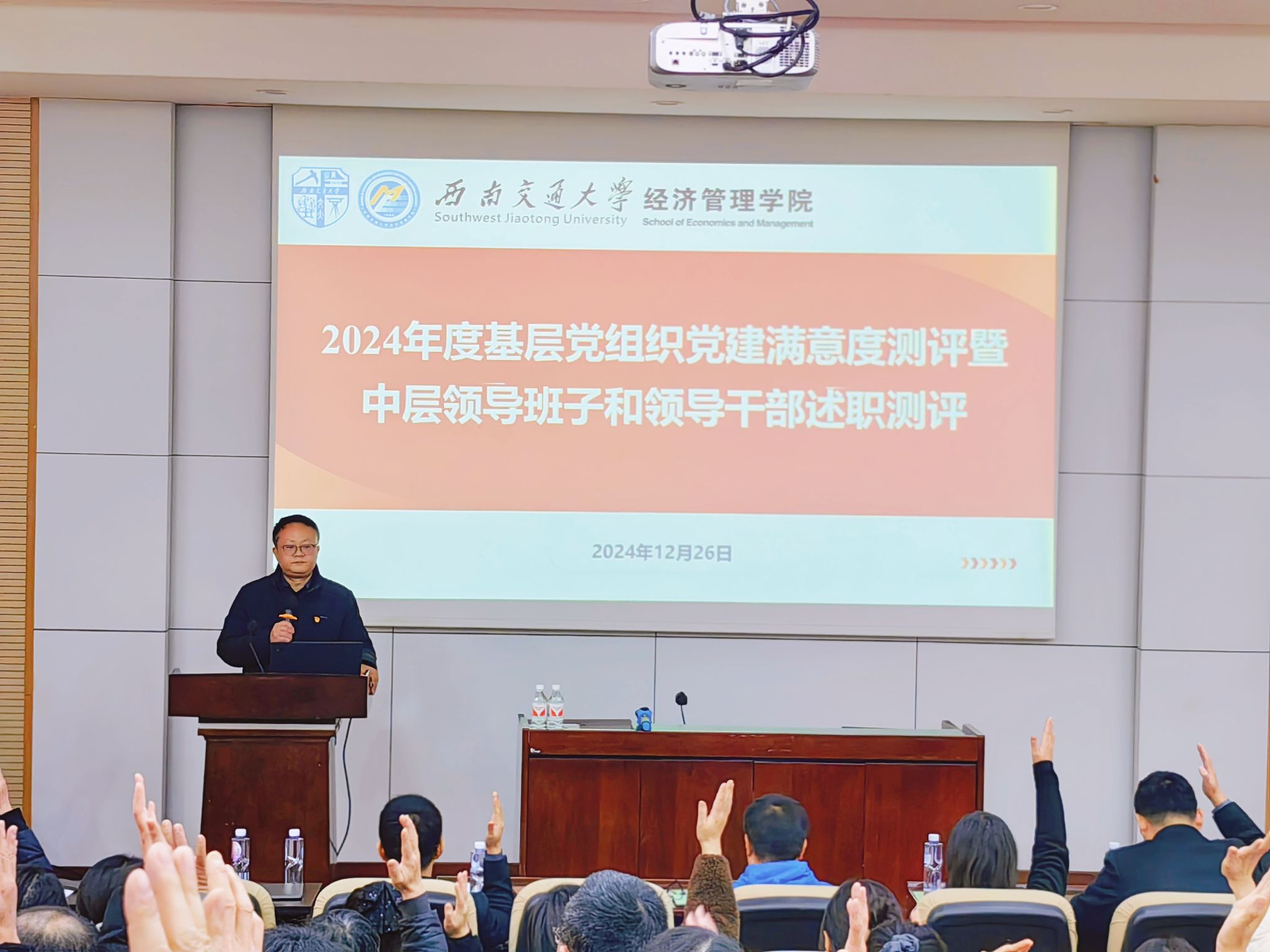 召开2024年度党建满意度测评和中层领导干部考评暨2024年双代会。学院党政领导班子全体成员、学院教职工和学生党员代表参加测评,会议由学院党委书记郭强主持。