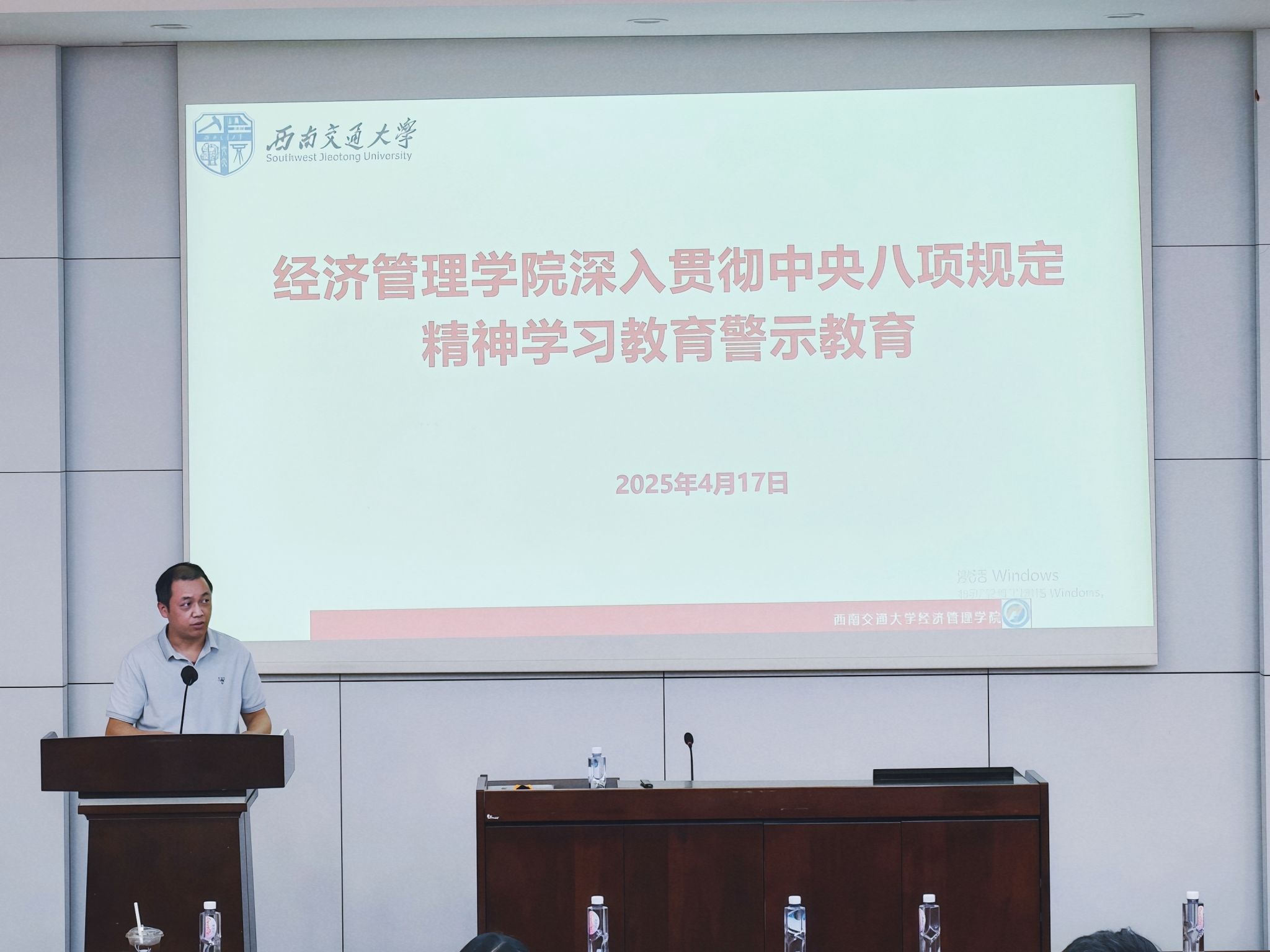 学院纪委副书记张震宇带领全体教职工深入学习中央八项规定精神,结合典型案例开展警示教育。张震宇指出,全体教职工要进一步提高政治站位,严守纪律红线,持续强化作风建设,将全面从严治党要求落实到日常教学、科研和管理工作中。