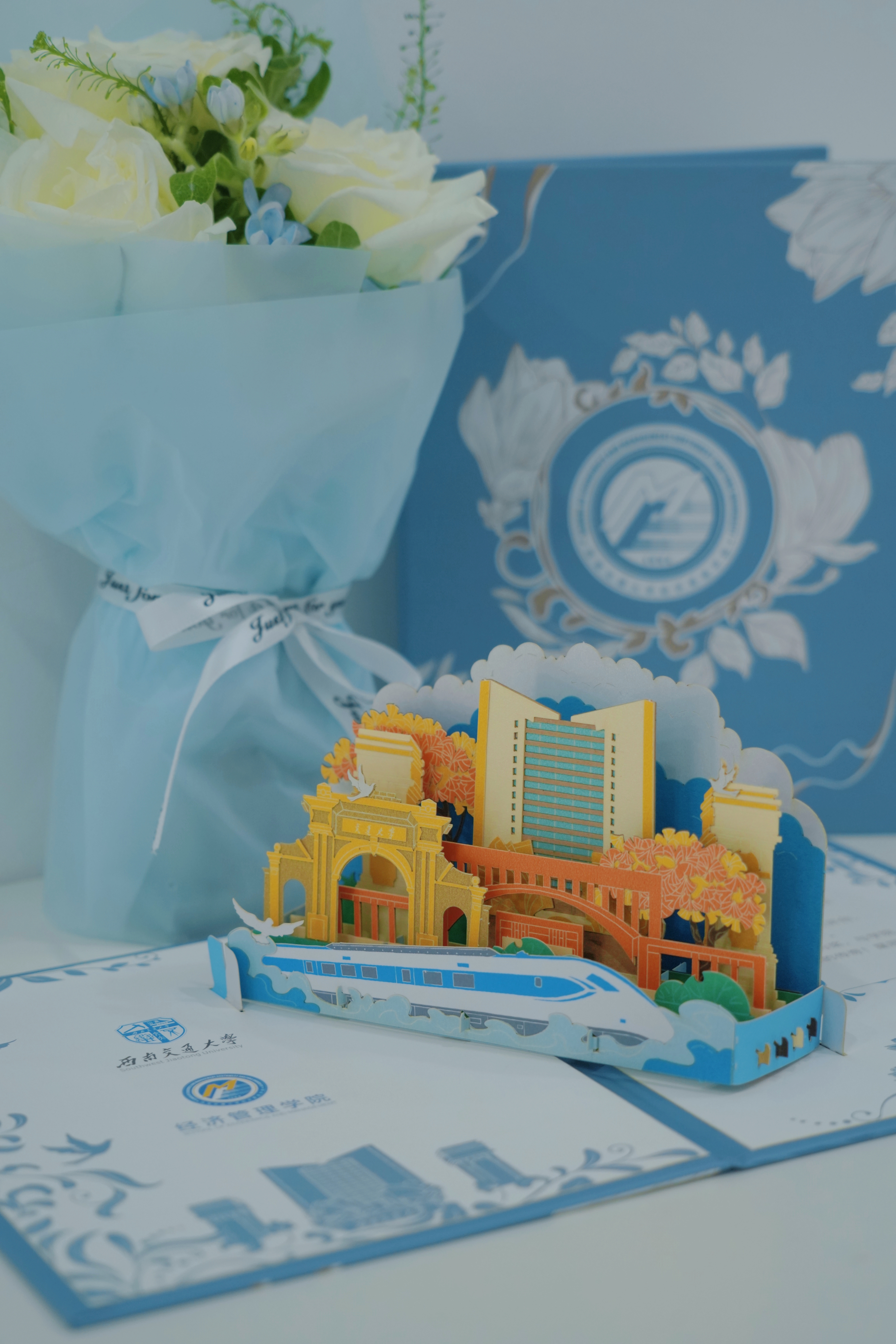 学院党委书记蒋佳为近期新入职的四位教师送上入职纪念立体卡片及鲜花。