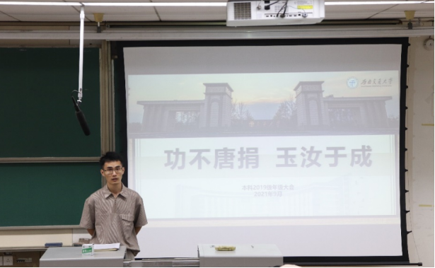 党委副书记杨宏毅、学院研究生教育中心主任马锋、本科教务员尹一、2019级辅导员向起锐作为嘉宾受邀参加了大会,2019级全体同学参加了此次年级大会。本次大会的主题为“功不唐捐,玉汝于成”,意在勉励2019级的同学在挫折中打磨自我,坚持奋斗。