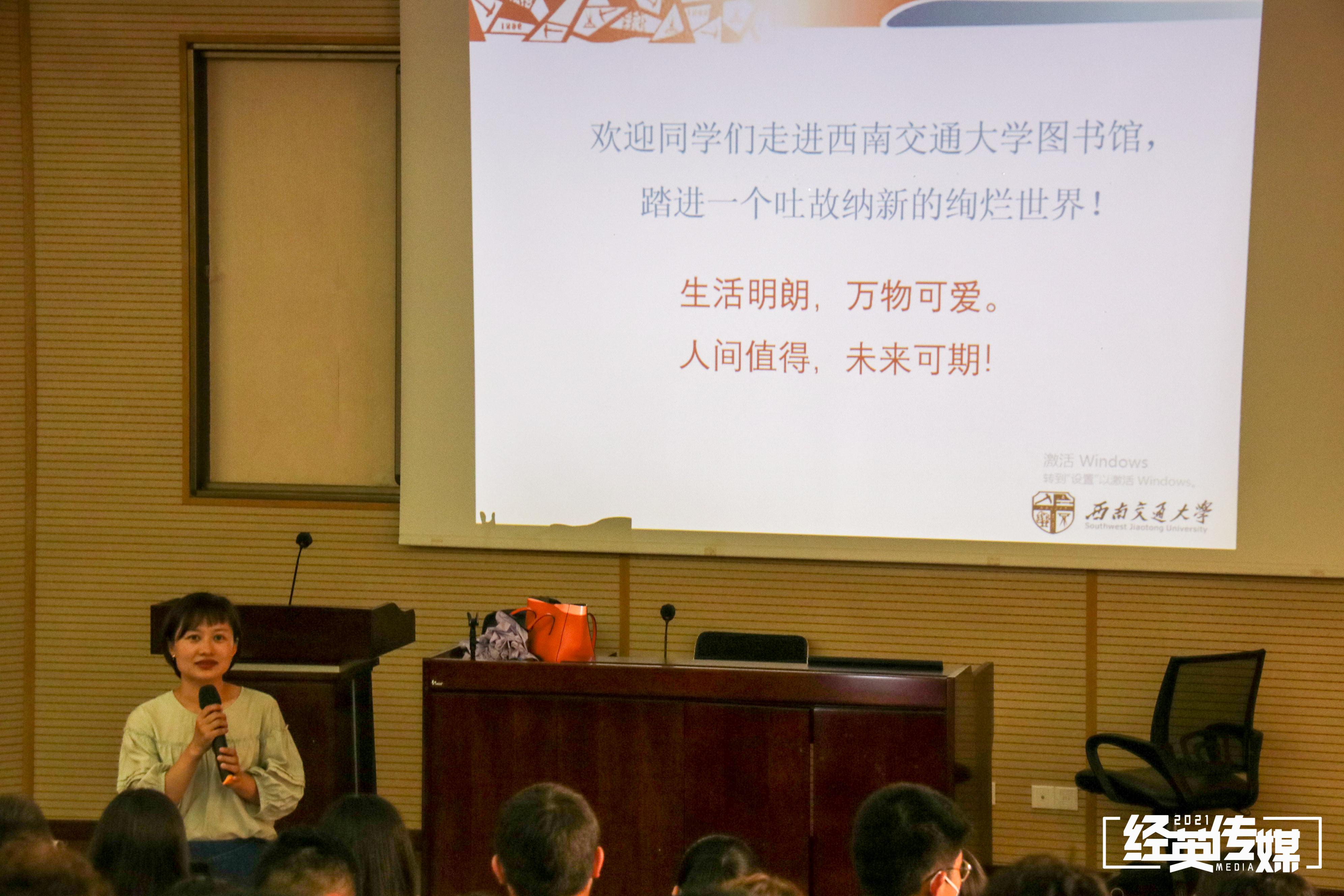 接下来,何雪梅老师为大家介绍了图书馆为大家提供的资源和服务。她提到,图书馆是文化中心、育人中心和学习中心。图书馆和图书馆指导的社团常一起举办文化活动和展览,丰富同学们的课余生活,为同学们输送精神营养。同时,图书馆拥有良好的学习氛围、丰富的学习资源,也开设了许多出色的通识课程。