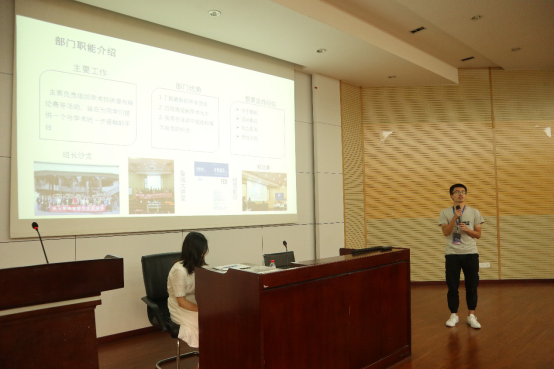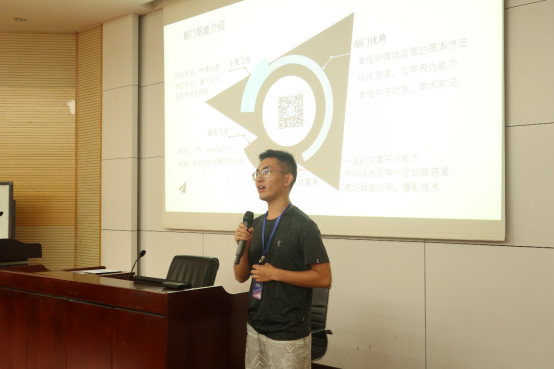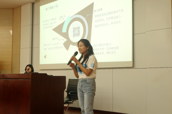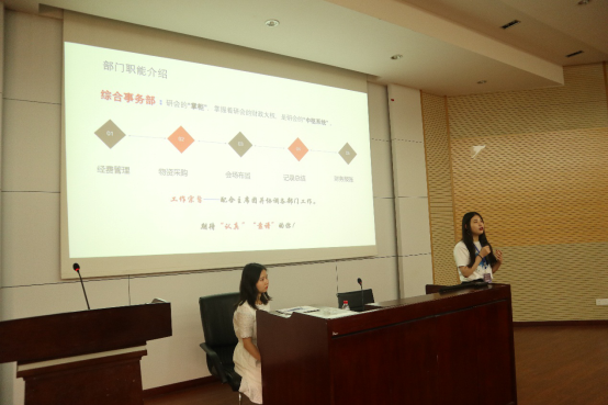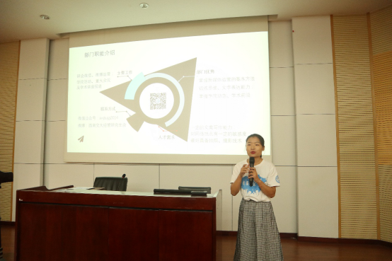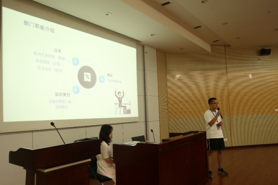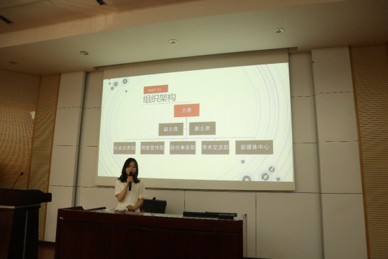 最大研会之一,连年斩获 “十佳研会”荣誉称号。研会是学生与学校之间的桥梁,经管研会对外志在配合学校,为学生服务,对内志在搭建平台,实现高校良性的自我管理。紧接着,刘依然同学就经管研会的组织架构、主要活动等做了介绍。经管研会共设五个部门:公共关系部、学术交流部、综合事务部、网络宣传部和新媒体中心。然后,各部门部长依次上台详细介绍了本部门的主要工作、技能需求,为新生加入研会提供了有利指导。最后,经管学院研会主席团成员结合自己亲身经历讲了为何要加入研会和加入研会的收获,现场新同学反应热烈。