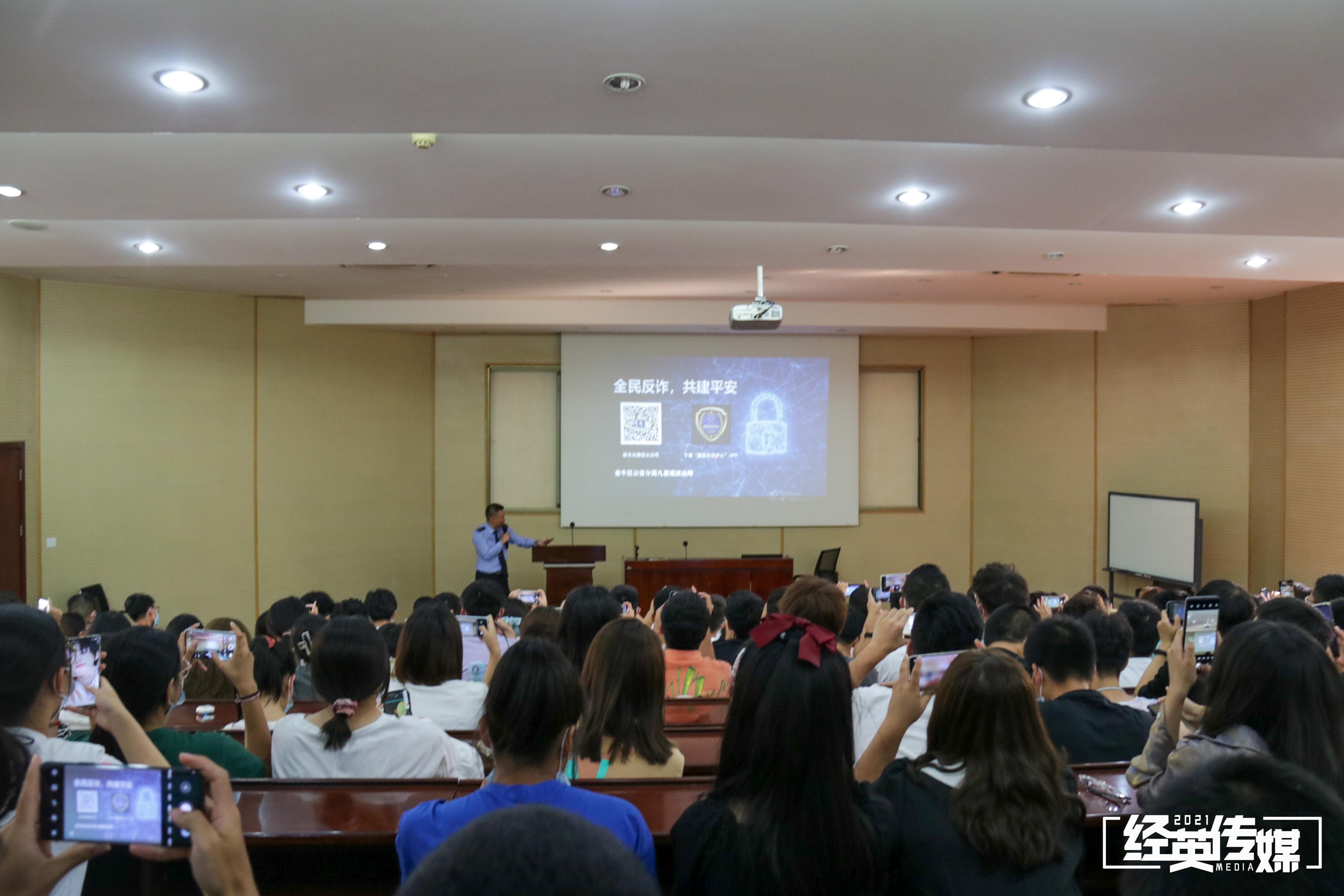 社区民警赵磊为大一新生带来了一场防范电信网络诈骗教育讲座。