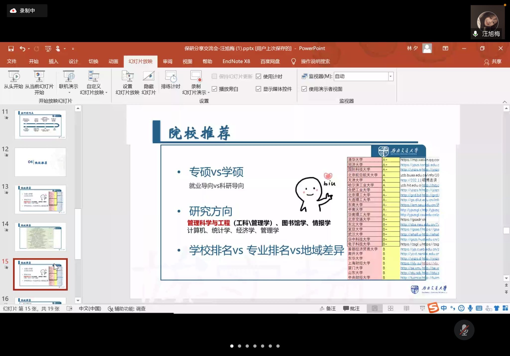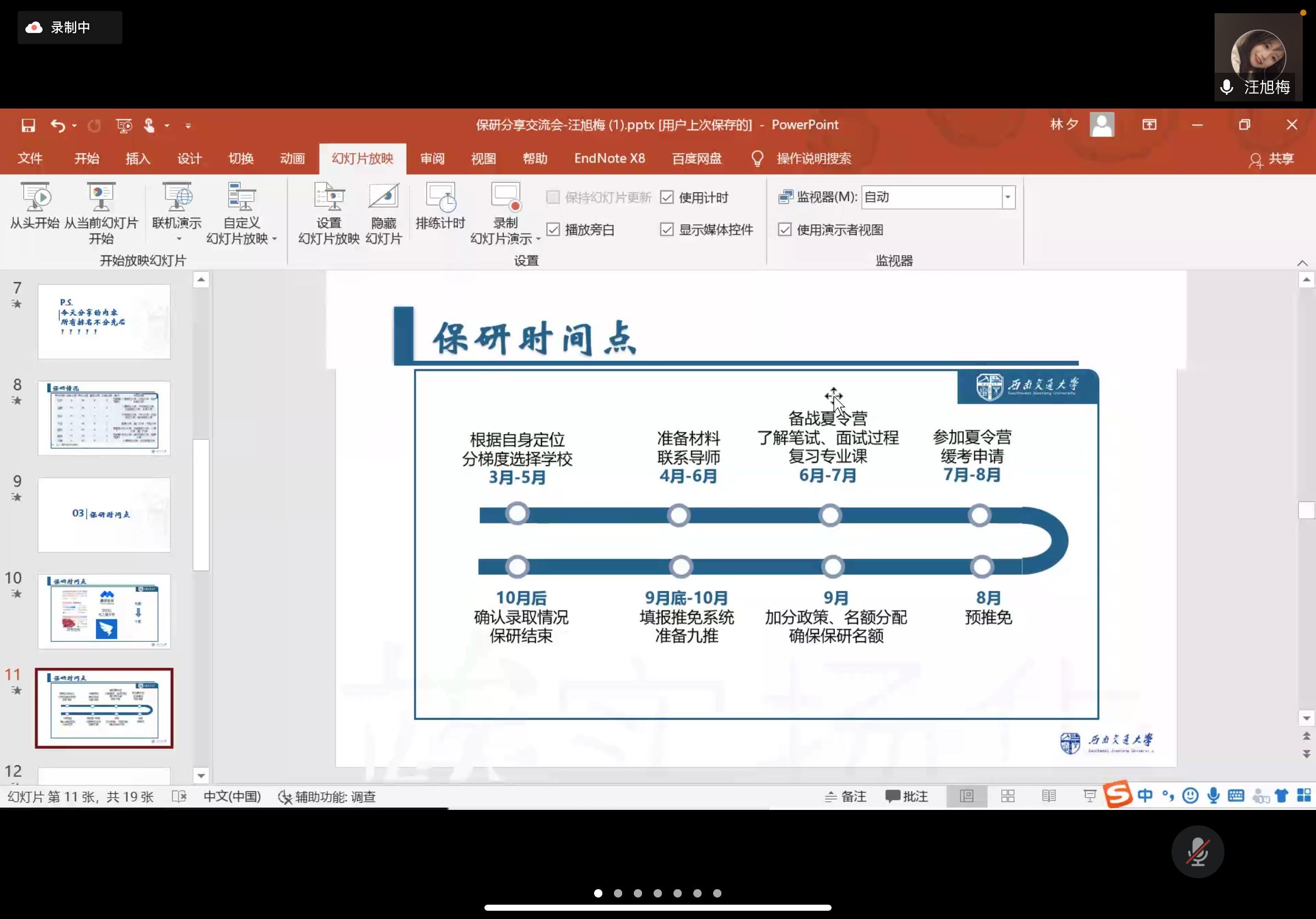 创新创业中心举办的保研讲座在腾讯会议拉开帷幕。本次讲座全程采用主讲人线上分享的形式,共有115名同学参与其中,整个过程历时约一个半小时。讲座伊始,六名交大优秀的保研学子分别从个人经历、保研材料准备、保研学校选择以及面试注意事项等方面全方位、多层次地对相关问题进行了讲解。