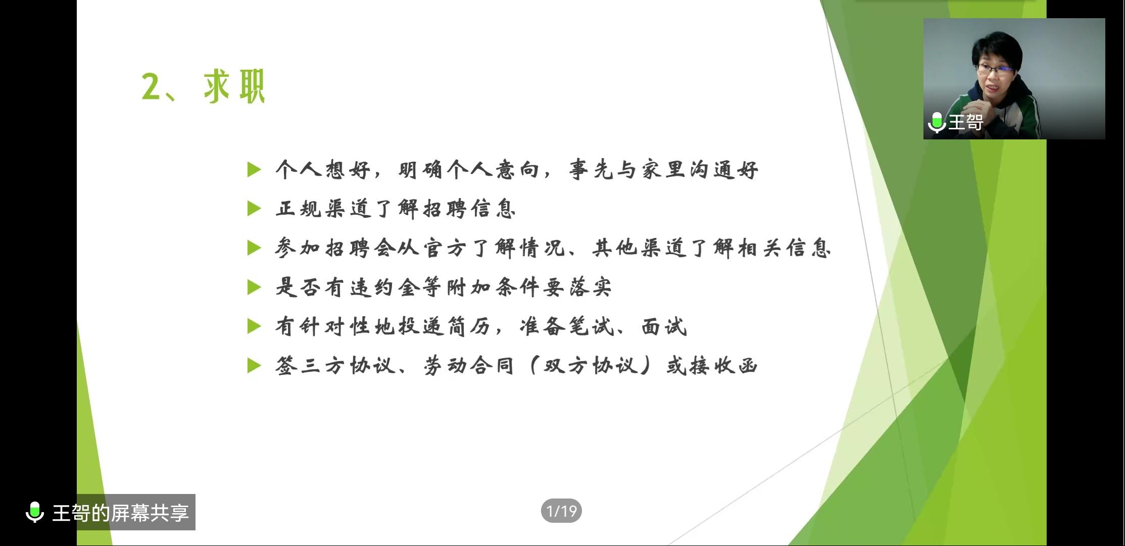 随后,向起锐老师就近期校园防诈骗工作进行宣传指导,提醒大家注意保护个人信息。同时补充说明了青年大学习相关事宜,并指出了同学们存在的不足之处,希望同学们能认识并加以改正。接下来由王哿老师做了升学就业指导的分享,她主要从春招、就业材料准备及求职渠道三个方面对大家进行指导。同时,王老师对当前的考研与就业形势进行了统计与分析,指出当前竞争的激烈,鼓励同学们早规划、早准备,努力提升自己和增强自己的竞争力。