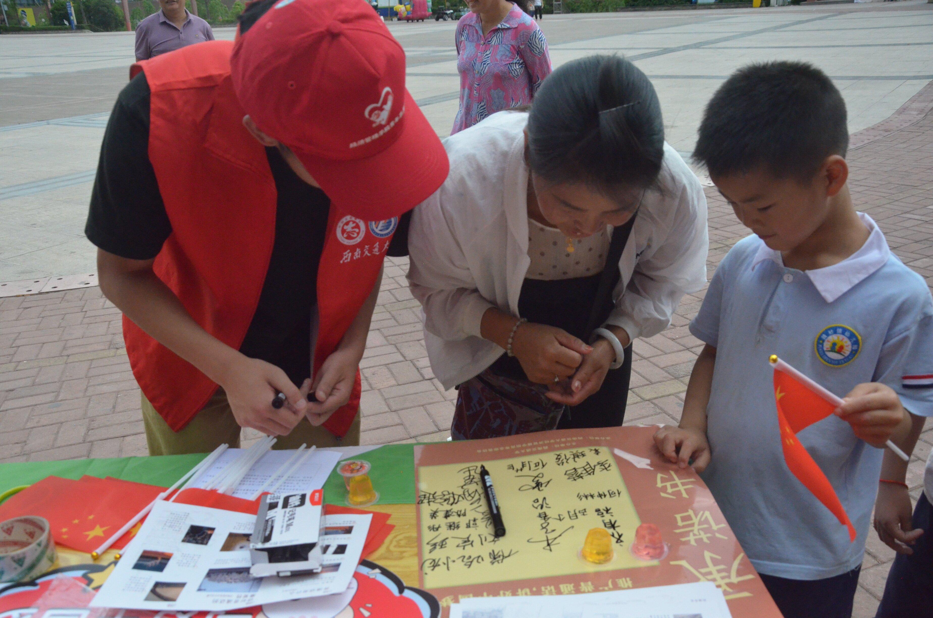一方面,团队为当地彝族同胞发放推广普通话宣传手册,积极宣传普通话的重要性。另一方面,团队邀请彝族同胞来到摊位旁,参加经典诵读,诗歌朗读,绕口令,一对一普通话正音等活动,并邀请他们签署普通话承诺书,希望他们可以在今后的生活中敢讲普通话,想讲普通话,能讲普通话。活动吸引了众多的大小朋友参与,实践队员与他们在欢声笑语中架起了普通话沟通的桥梁。在”说好普通话,写好中国梦“的口号中,拉近了与他们的距离。