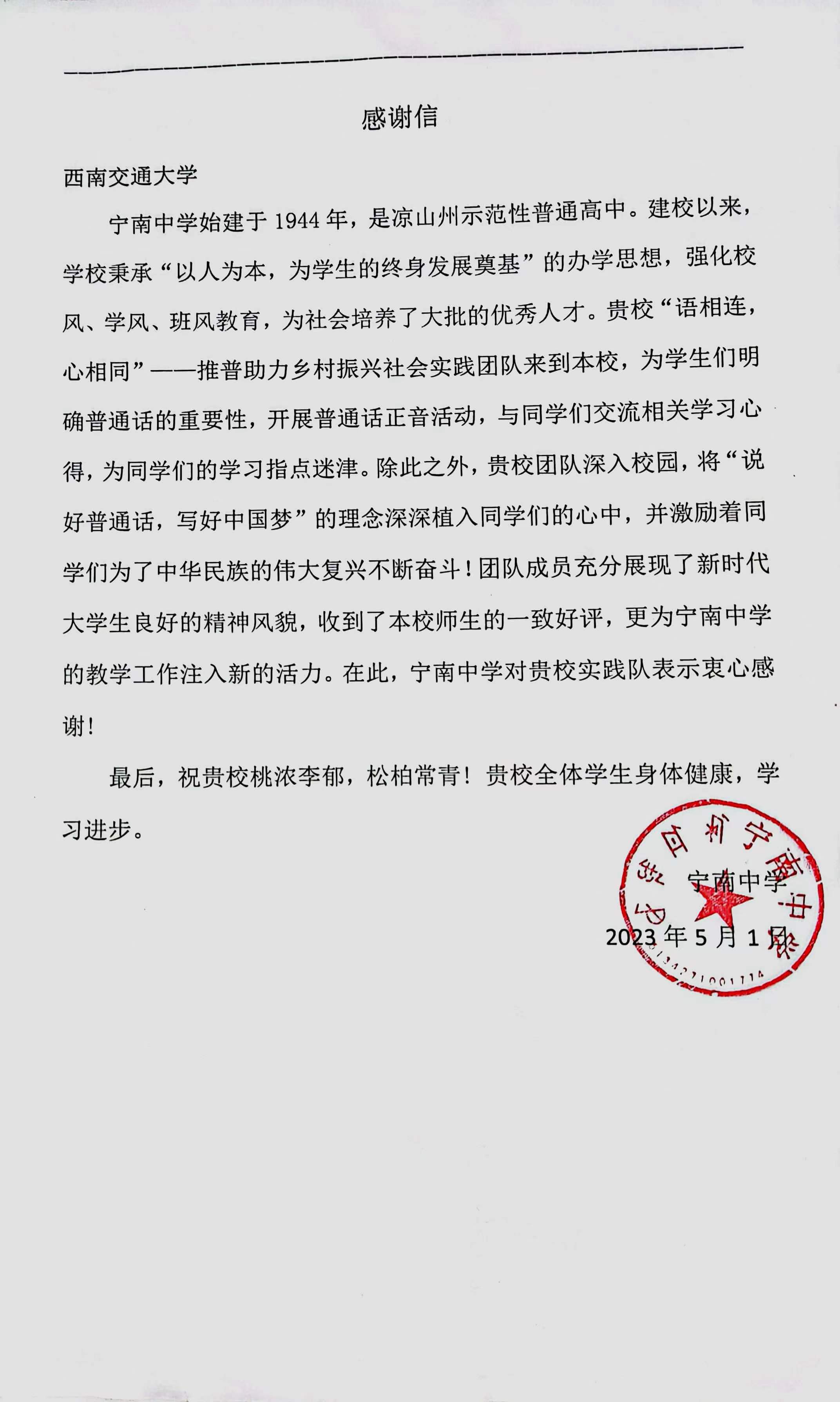 此次实践,队员们深入基层,致力于国家通用语言文字推广,为语言文字教育助力,为乡村振兴注入青年力量。活动得到了当地政府、群众的大力支持和一致好评,活动结束后,实践团队收到了来自宁南一中的感谢信。