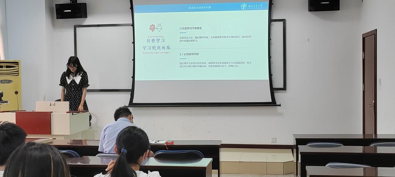 各班级结合期中考试成绩情况以及本学期班风学风的改进措施、成效和问题进行了简要总结;同时,临近期末,各班也表示正通过邀请任课老师答疑、班级学习打卡、小组互助等措施来督促班级同学认真备考,紧抓学习状态,营造更浓厚的学习氛围;此外,班长们还分享了在2022-2023学年优秀班团集体评选比赛中,班委们如何组织、凝聚同学们的准备过程和自身收获体会。