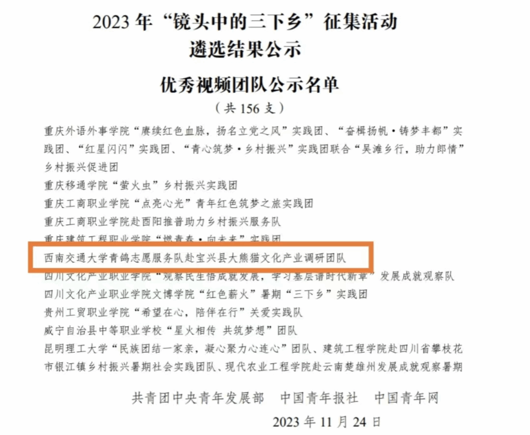 “推普进羌乡,文字连万家团队”以及“青鸽志愿服务队赴宝兴县大熊猫文化产业调研团队”入选2023年全国大学生暑期社会实践优秀团队。其中,“推普进羌乡,文字连万家团队”入选优秀图片团队;“青鸽志愿服务队赴宝兴县大熊猫文化产业调研团队”入选优秀视频团队。