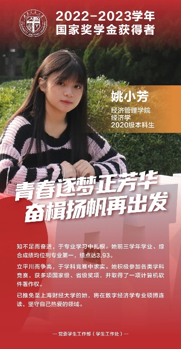 “严谨为学,孜孜以求”。本科2020级姚小芳同学作为国家奖学金获奖代表接受表彰。刻苦是他们身上凸显出的力量,优秀是他们身上折射的符号,他们用热情,书写青春奋斗的诗篇,用榜样精神引领交大学子接续奋斗。