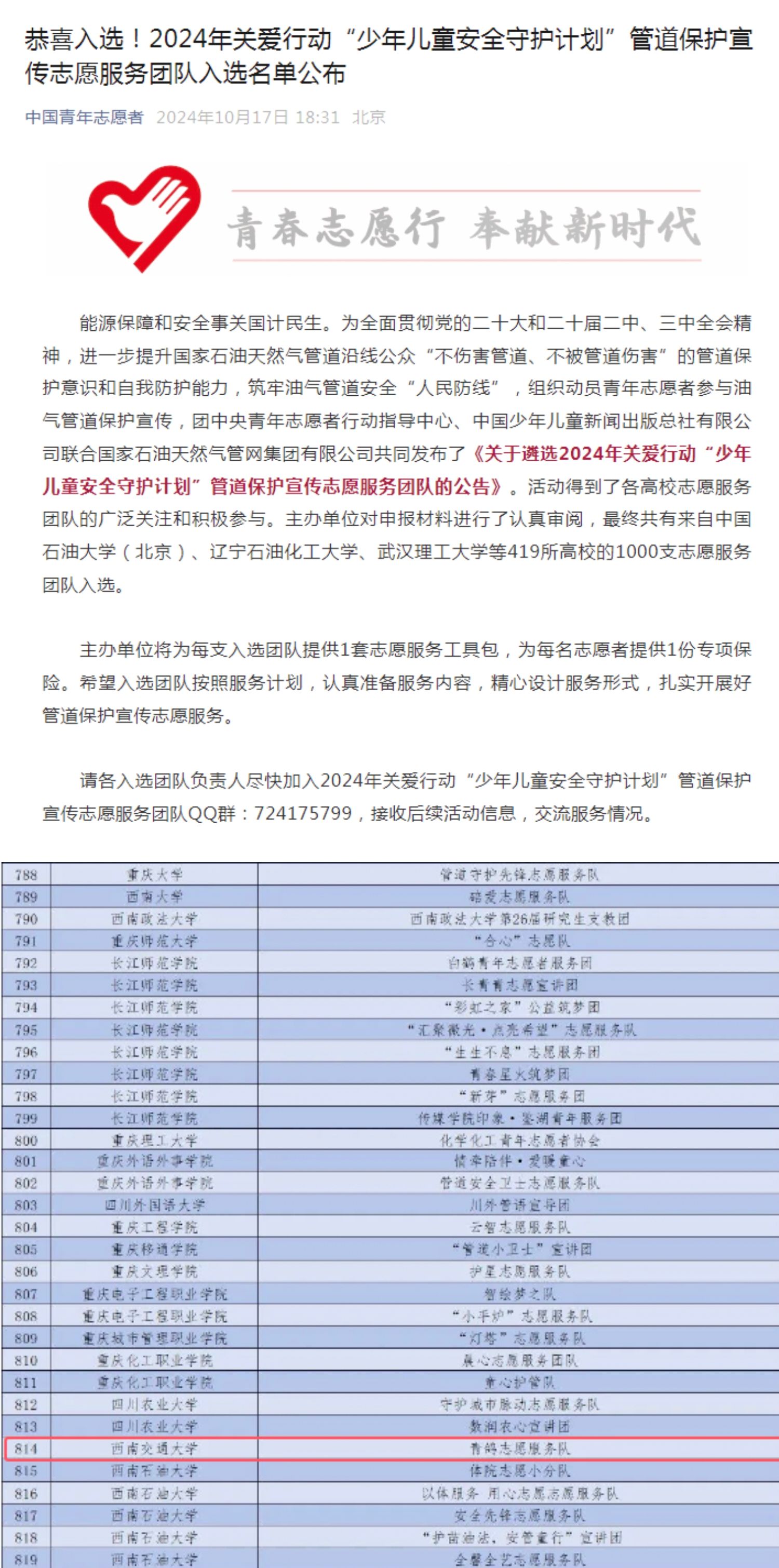 “青鸽志愿服务队”从全国419所高校的几千支队伍中脱颖而出,入选2024年关爱行动“少年儿童安全守护计划”管道保护宣传志愿服务团队。