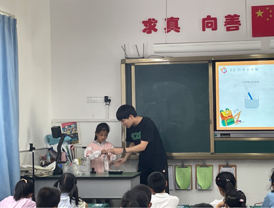 活动第二部分以科学为主题,由王丹同志向小学生们展示了科学小实验——“会爬升的水”。在实验后介绍了相关原理,小朋友们也积极地提出和回答问题,举例生活中自己感受到的气压,例如吸管喝水、吹气球、坐飞机等等。在做了一遍实验示范后,王丹同志邀请了一位小朋友亲自进行实验,共同感受实验的乐趣。